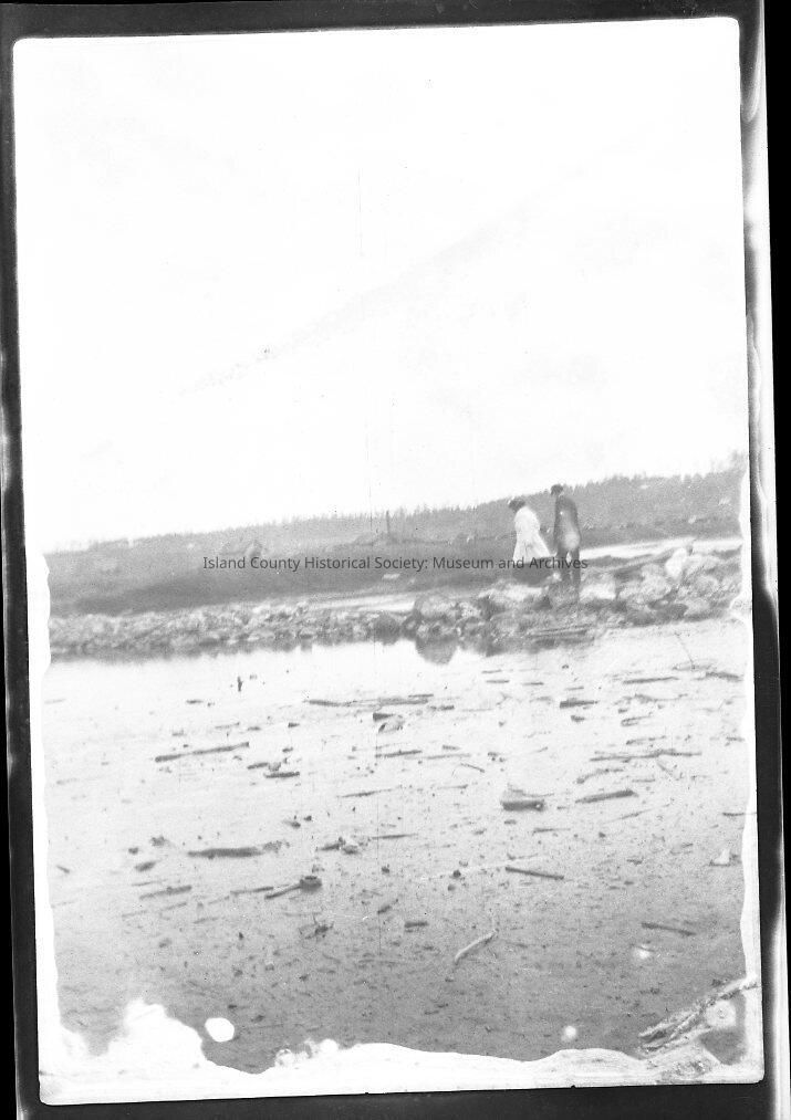 Black and white. A man and woman are walking on a beach area. Small logs and other debris in the foreground. She is wearing a hip-length coat. He is wearing a suit and hat. Buildings in the background.Made/Created