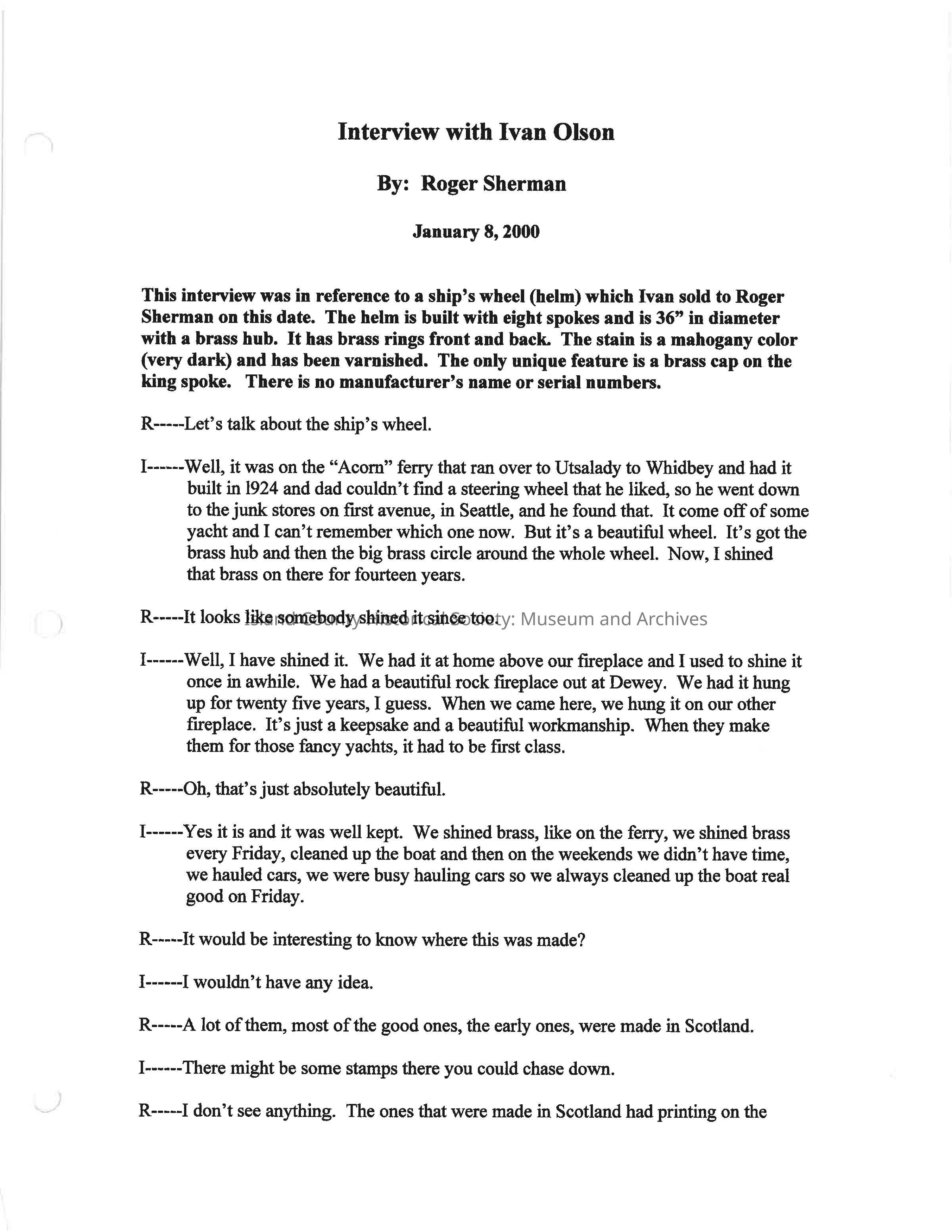 Interview in reference to a ship's wheel (helm) which Ivan sold to Roger Sherman on this date. The helm is built with eight spokes and is 36" in diameter with a brass hub.Creator
