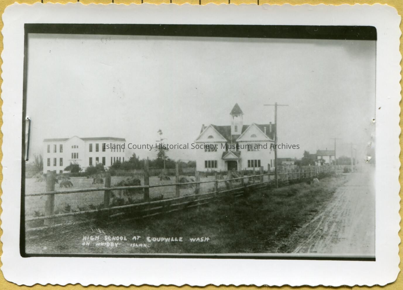 Two large white buildings that were the High School At Coupeville Wash on Whidbey Island.