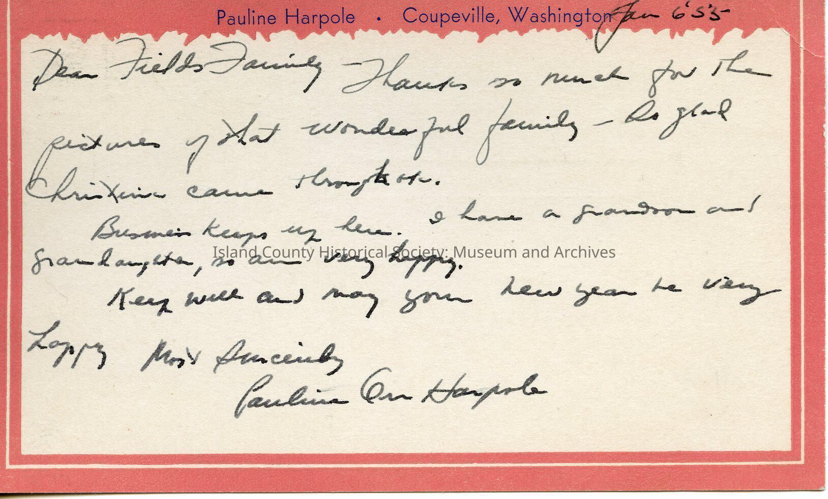 Note Card from Pauline Harpole of Coupeville Washington dated January 6, 1955. The notecard is red and white and has a message written on it that states: