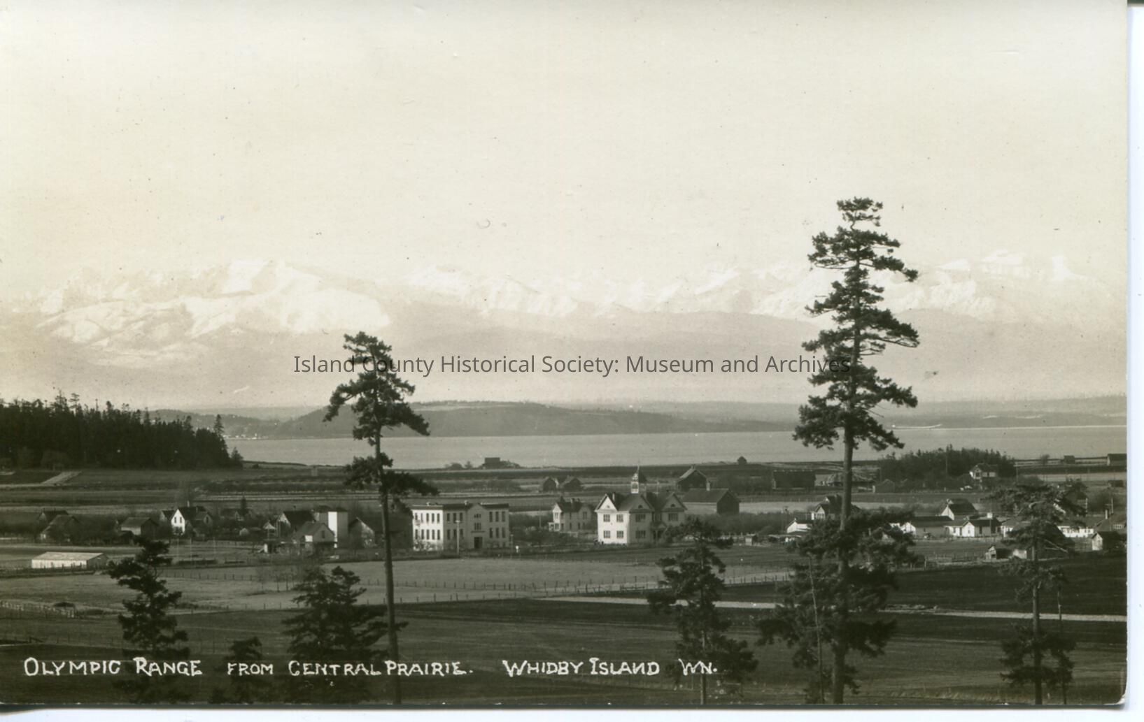 A postcard showing the central prairie on Whidbey Island with the Olympic mountains in the distance. Written on the front " Olympic Range from Central Prairie Whidbey Island Wash."