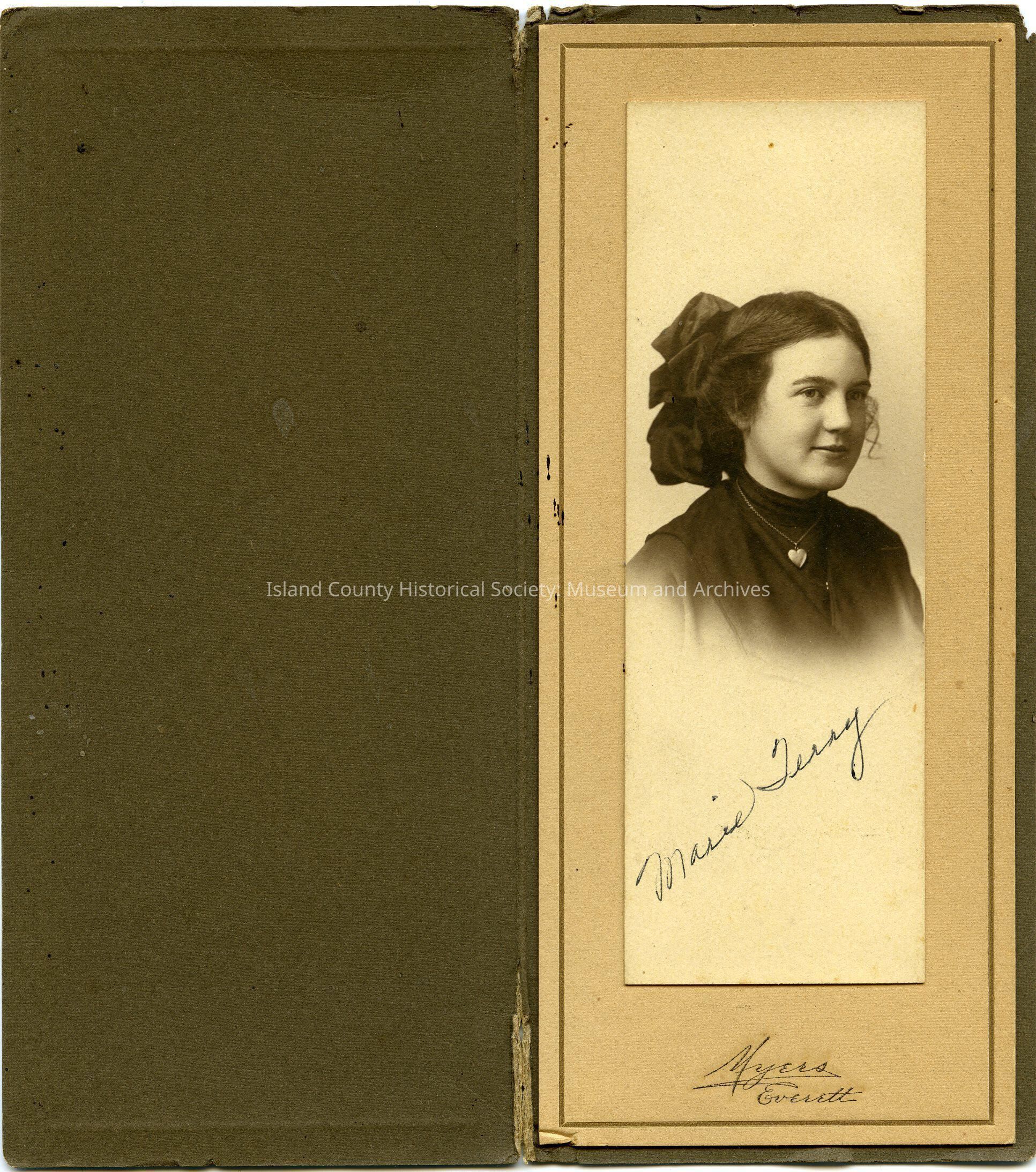 Studio portrait of a woman from the shoulders. She is wearing a heart locket necklace. Large bow on the back of her head. Across the front of the photo: Marie Terry. On the back of the photo: Marie Terry, Jan 8, 1912. The photo is on one side of brown cardboard; the left side folds over the photo.