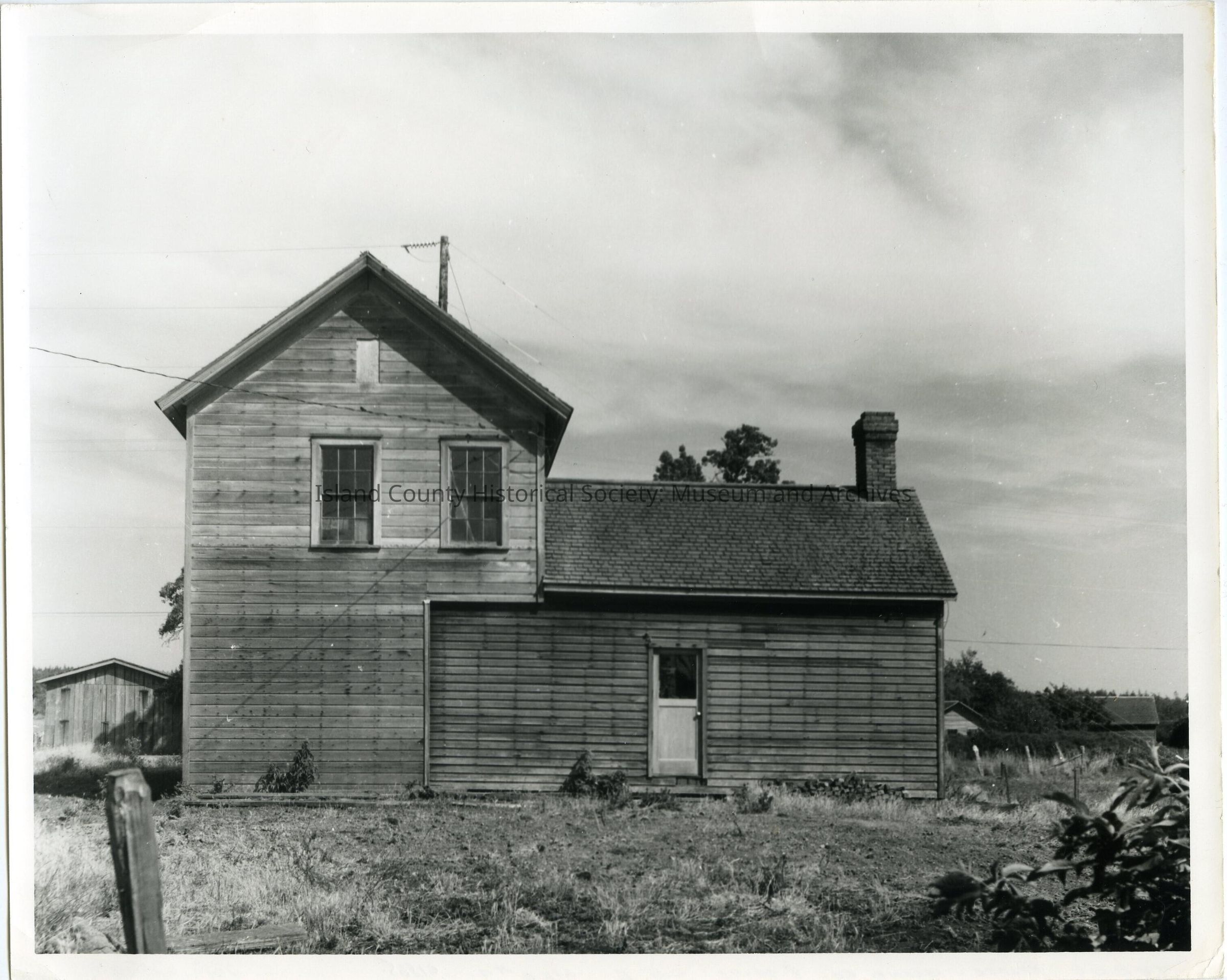 Photo of a wood house, chimney on the one-level section on the right. Two windows on upper story, door on the lower section. Power/Telephone lines to the house. Probably a barn to the left of the building. On the back: Terry place, Island County, Aug 20, 1971. C.13 E. NEG. #7. c 1865.