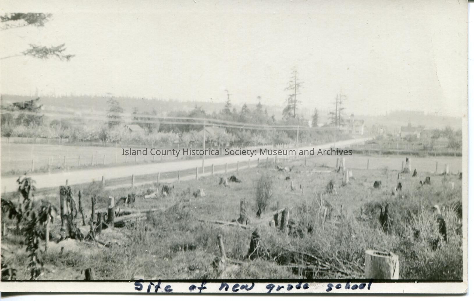A postcard of a field with a lot of tree stumps with a stand of trees in the distance. Written on the front of the postcard at the bottom " Site of new grade school" AZO postcard issuede: 1904-1918