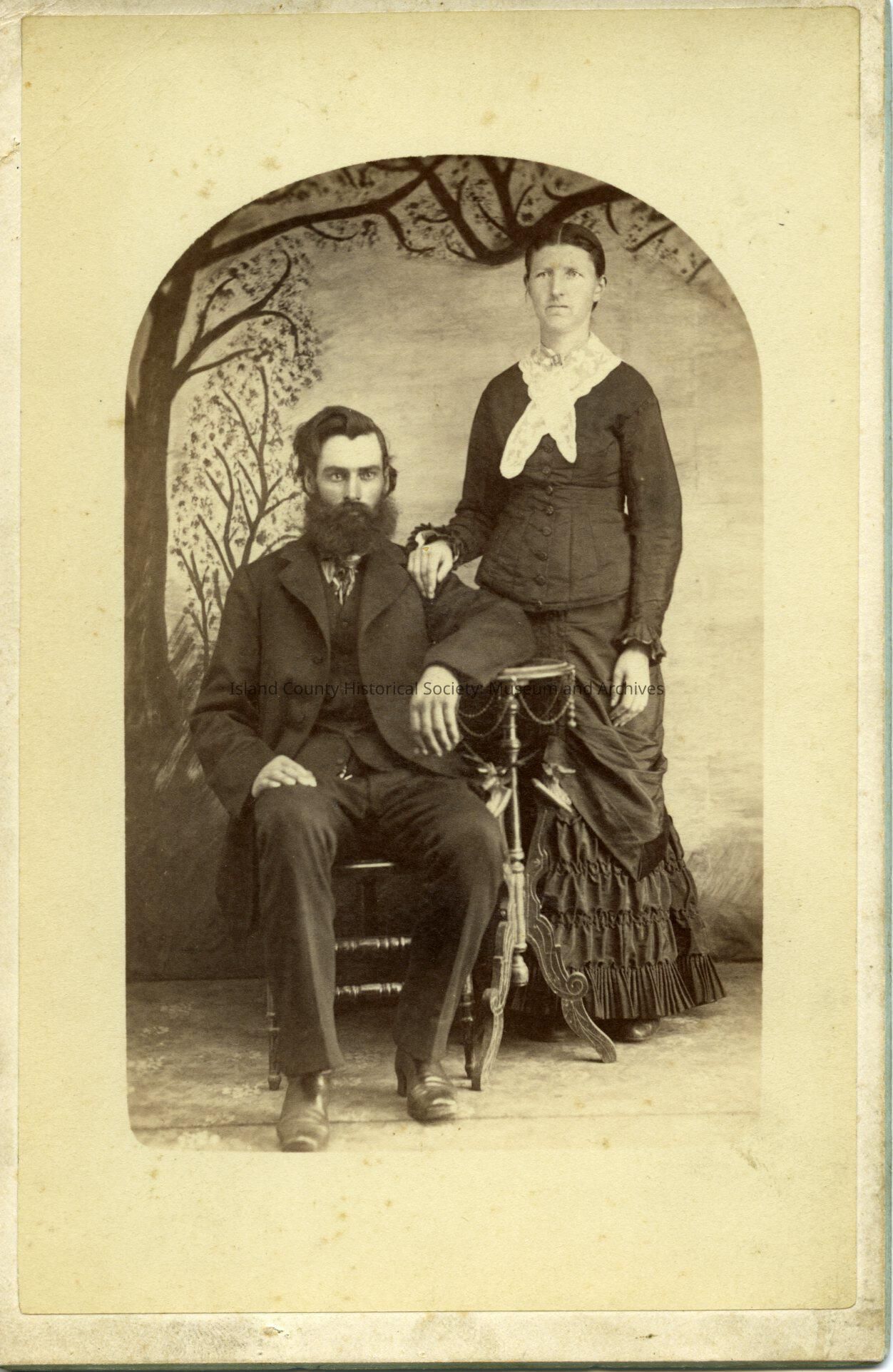 Wedding picture of Paul Cunningham and Mary Eliza Seaman. Married in St. Vincent Canada, March 19th 1868. Came to Whidbey Island from Wyoming 1906. Lived in Bayview. "Watkins Sales man" Photo is on cardboard. On the back: "Property of Cora Cook"
