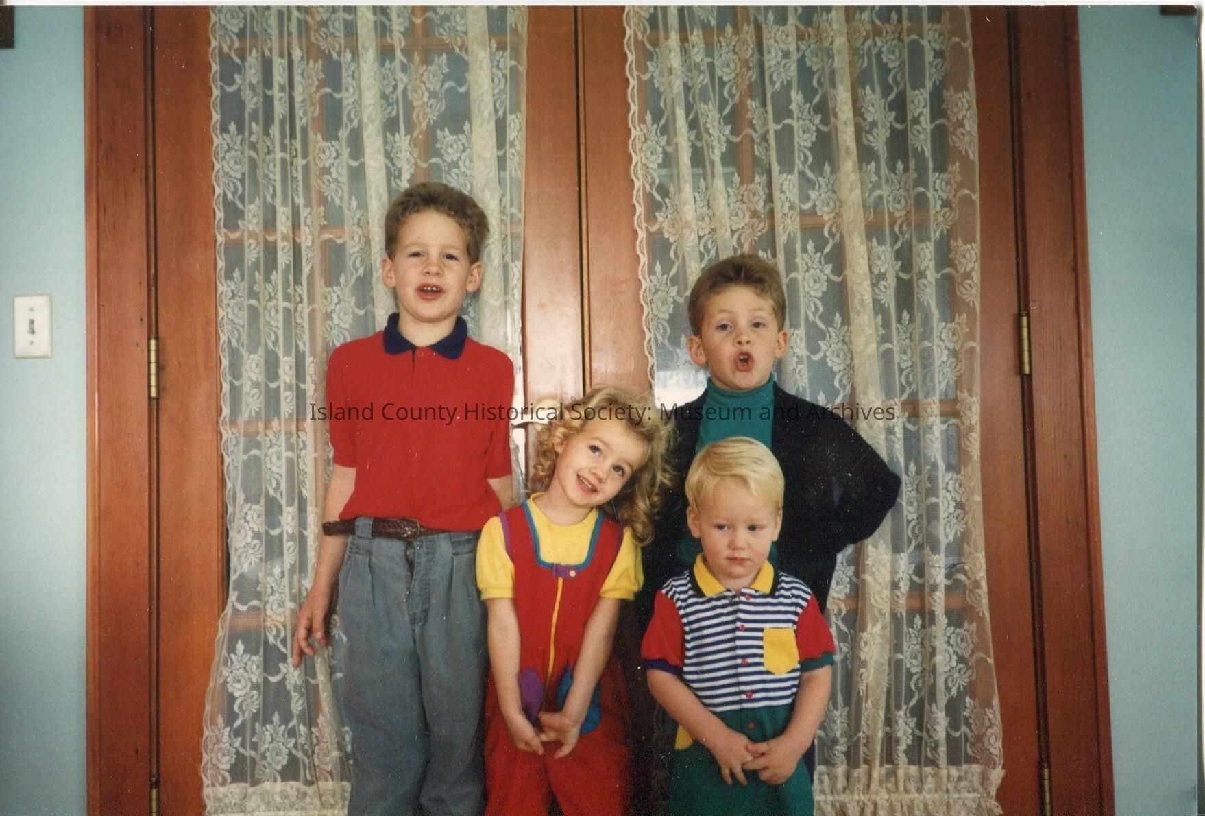 Color photo of four young children approximate ages 3 - 8. There are three boys and one girl. They are standing in front of a french door. No description and no date.