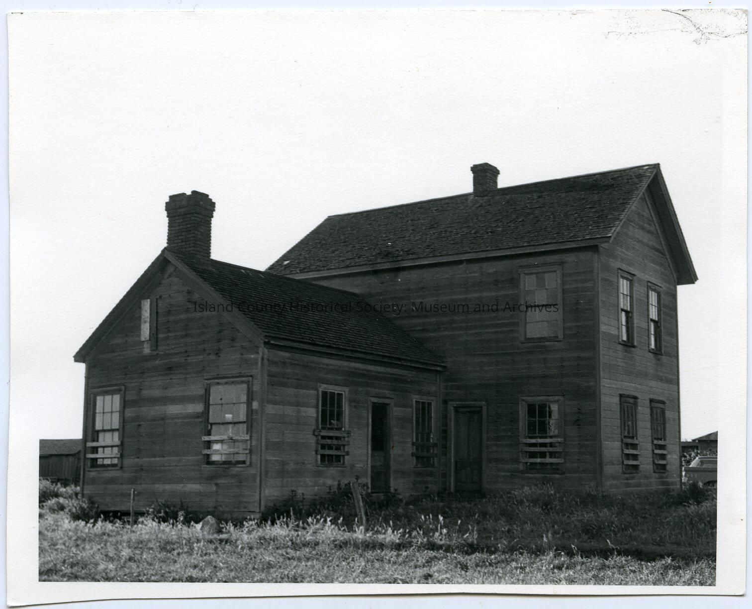 Photo of a wood house, chimney on the one-level section on the right and on the center of the top floor. Three windows on upper story, windows on lower section (lower half of the windows have wood slats over it), two doors. On the back: #14 (scratched out) Charles Terry house c. 1866. 66A Charles Terry 1866. Photo taken 1971