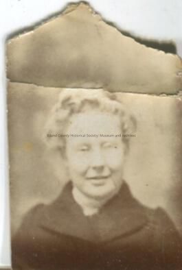 Black & white photo of the head and shoulders of a woman. The woman has light colored hair is dressed in a high collared coat. No description or date. The photo is torn at the top.