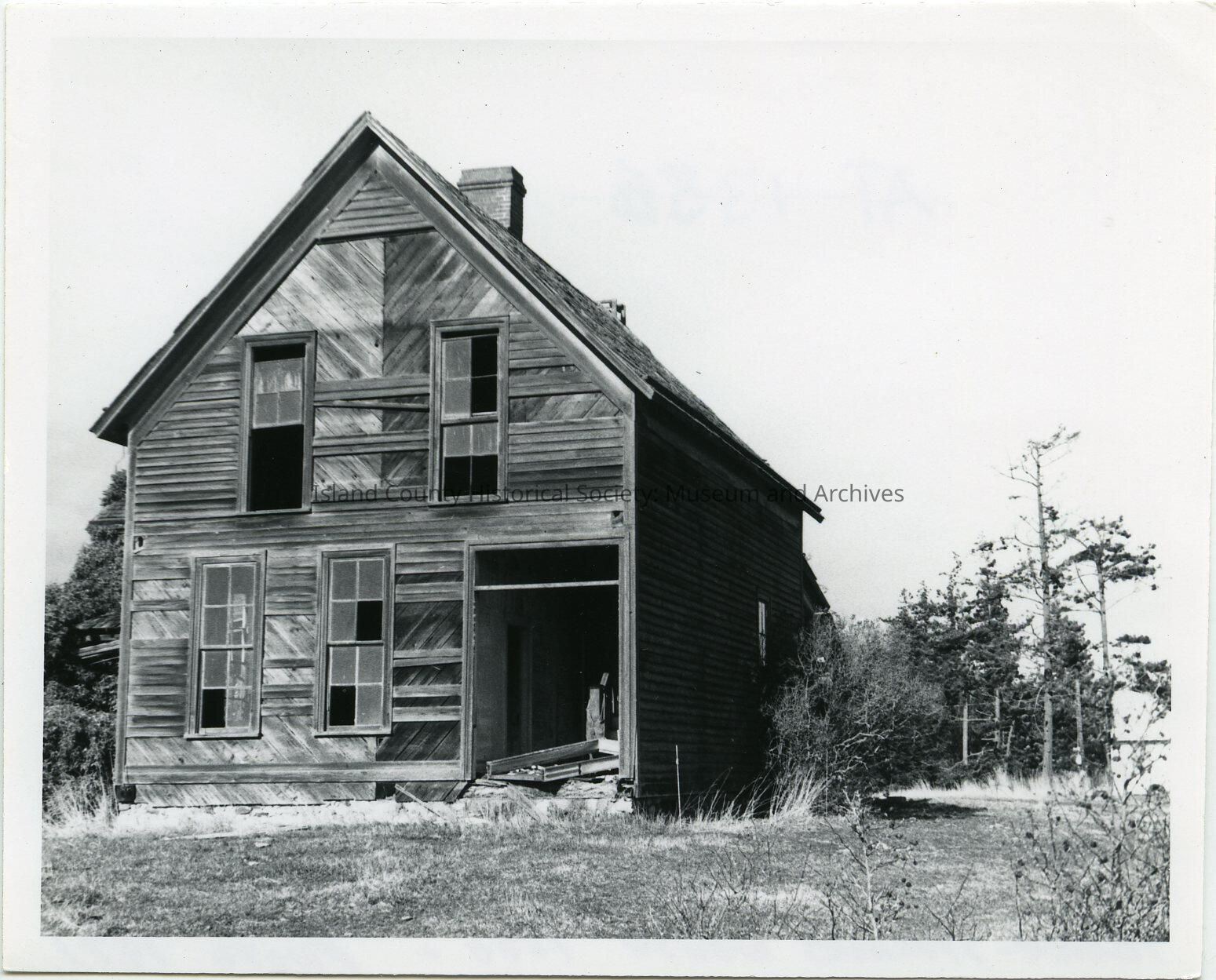 Photo of a two-story wood house, chimneys center of the top floor. The windows have holes in them. The roof is damaged. The door at the front is missing. There is debris in the doorway and parts of the wood siding are missing. On the back: Grove Terry-Dick Straub house c. 1880. Terry-Straub house 1880. Photo taken 1971.