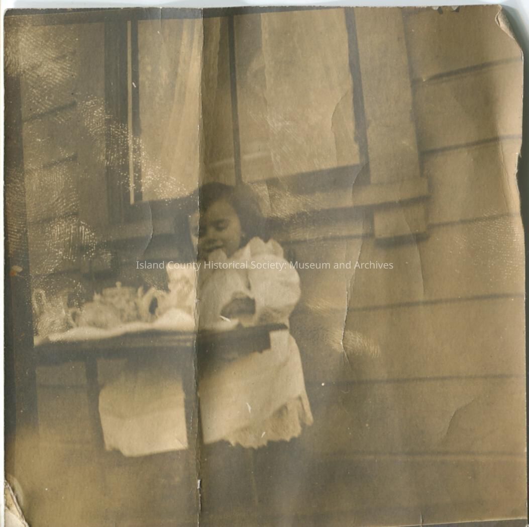 Black & white photo of a small child (maybe 2 yrs. old) in a long dress with a frilly collar, sitting at a table with teapots. The picture was taken outdoors under a window. No description or date.