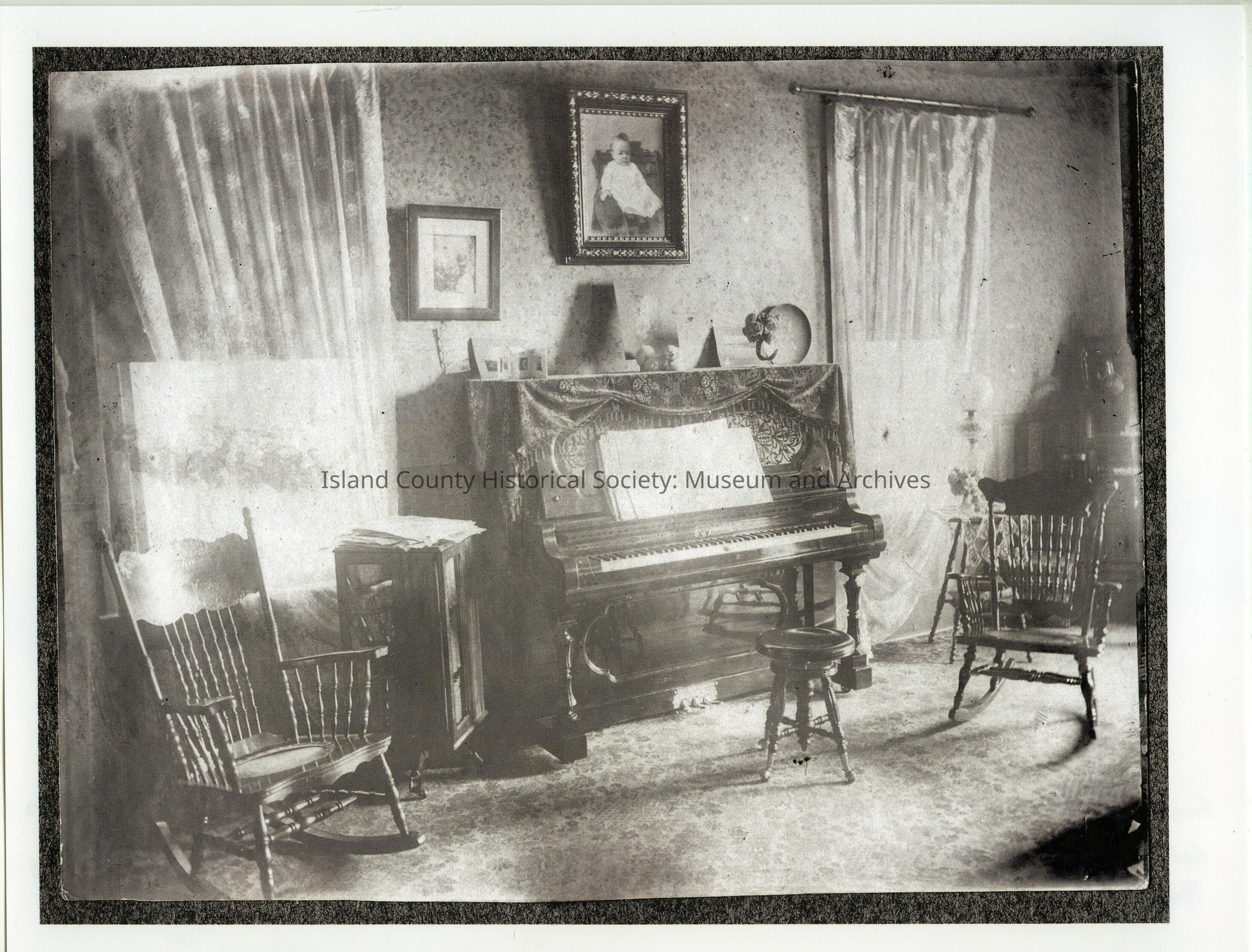 Photo of the interior of a house, the front room or parlor. An upright pian with piano scarf on the top is in the center agains the wall. Lace curtains, patterned carpet. Portrait of a baby and another of a family are on center wall. Two rocking chairs, piano stool, book cabinet, small table with globe lamp, and other small items are in the room. This is a photocopy of a photo on cardstock. On the back: From photo album #40. Collected by Lem Wannamaker. Home interior. (Wanamaker)
