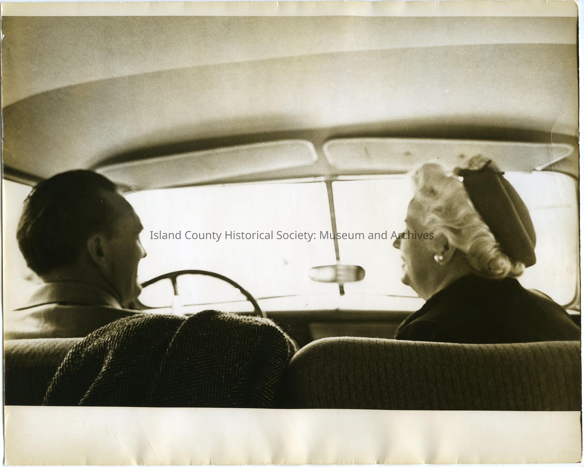 Photo of a woman with hat, coat and earrings in a car with a man. They are talking.