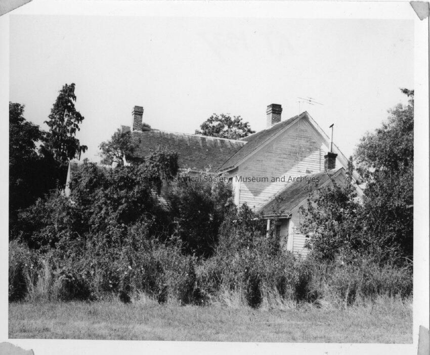 Side view of John Crockett's house built in the 1860's it is surrounded by overgrowing brush.