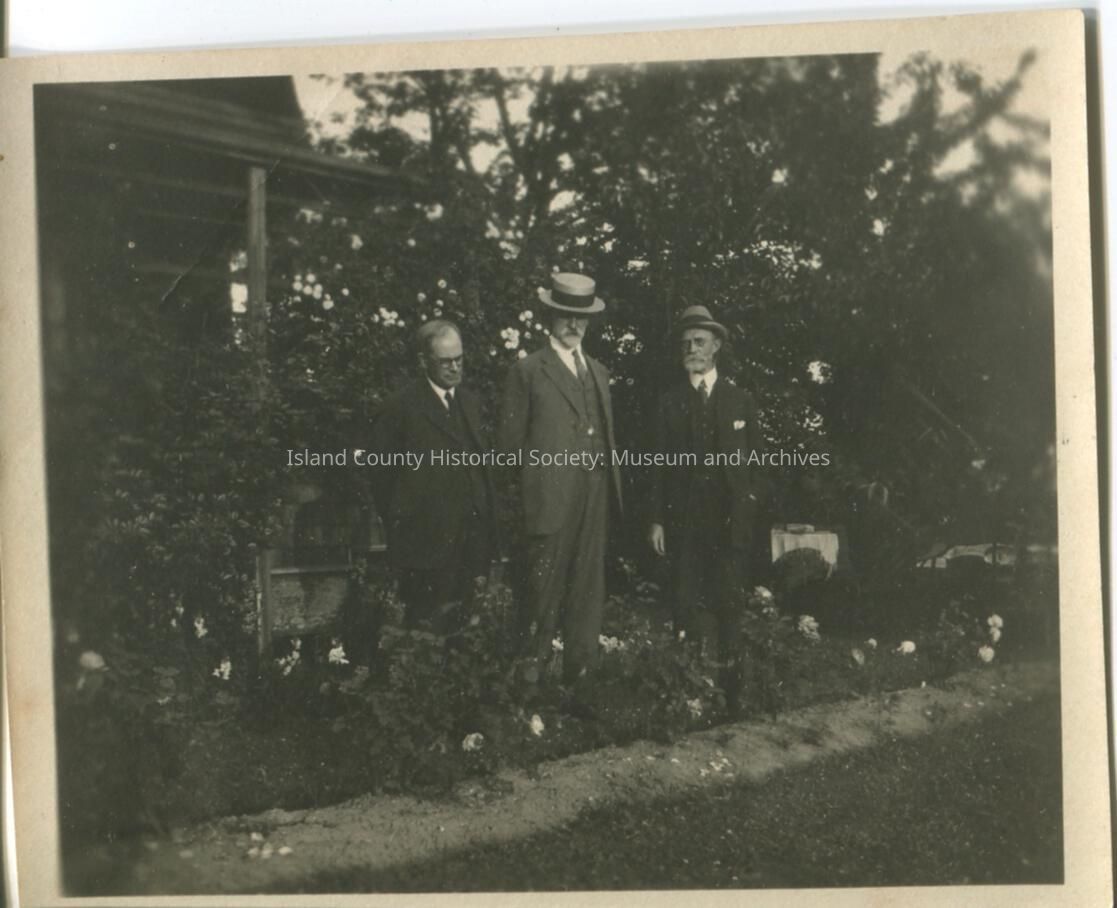 Black & white photo of three older men standing in a garden. All three men are in 3-piece suits. Two men are wearing brimmed hats. No description or date.