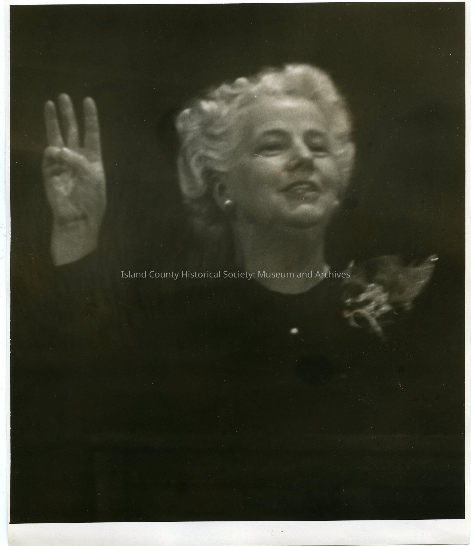 Photo of a woman, with her right hand raised next to her head and three middle fingers pointed up. She is wearing a dress with corsage, earrings. She is probably giving a speech. The woman is Pearl Wanamaker.