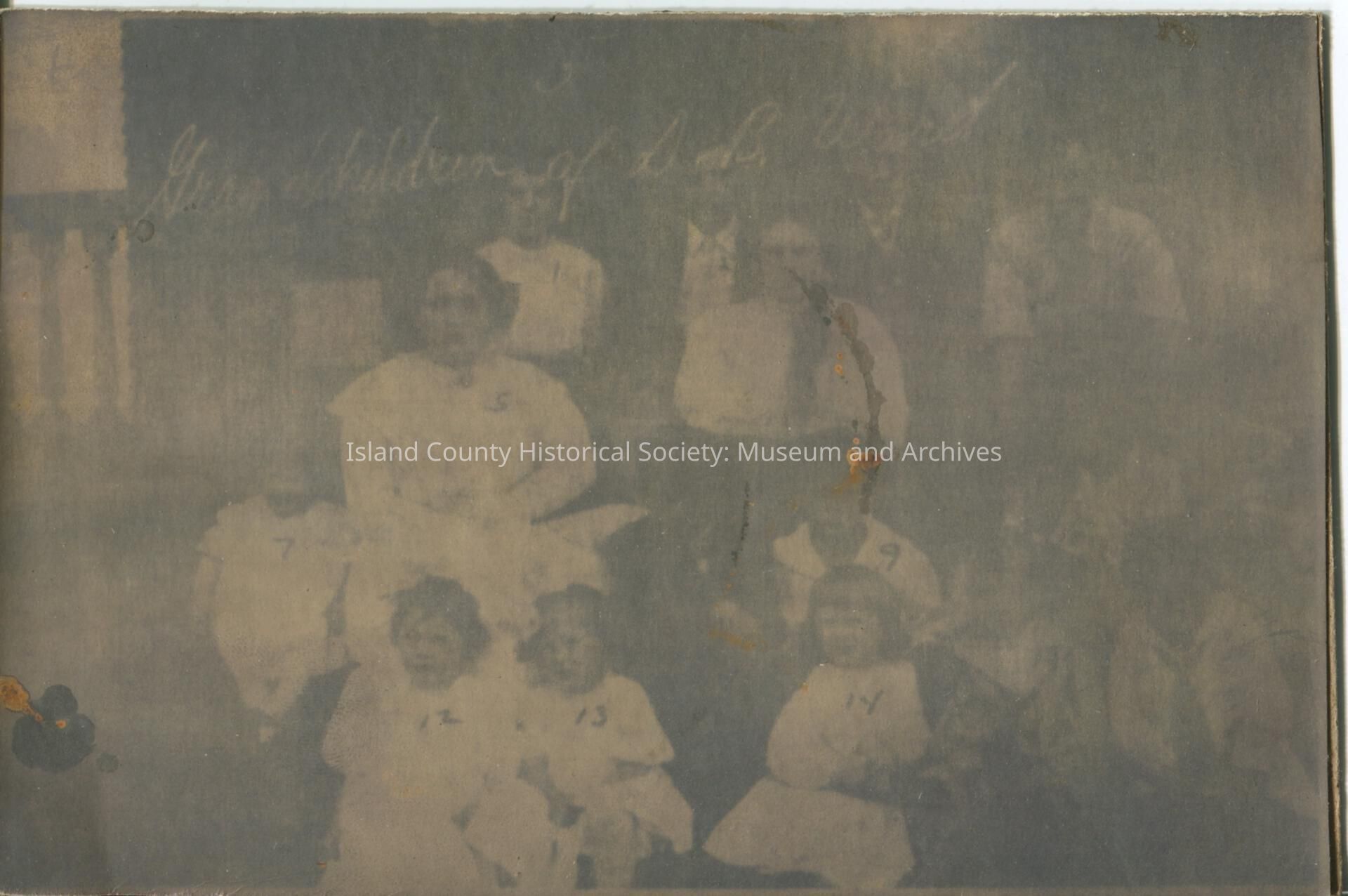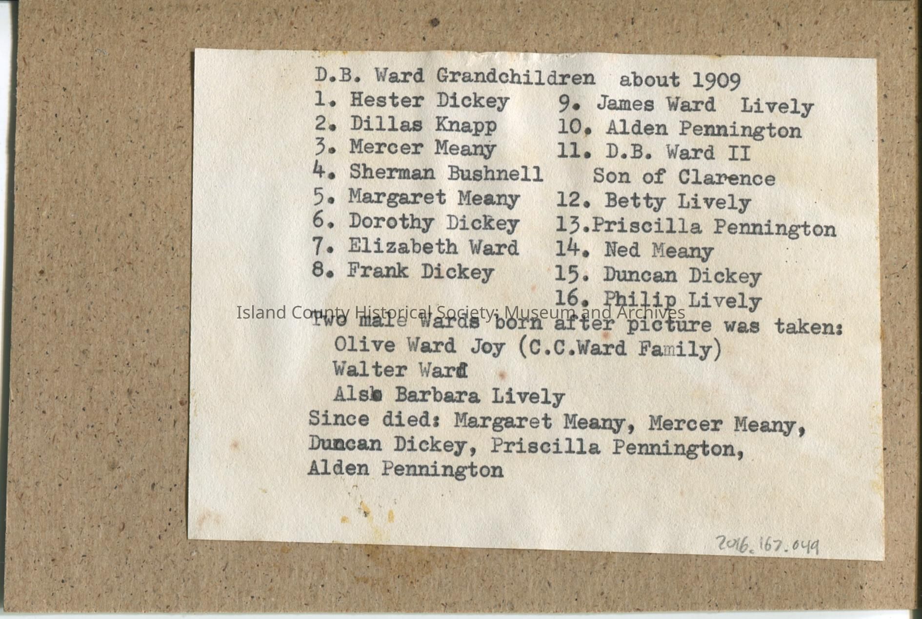 Black & white photo of a group of children and young people. On the front is written, "Grandchildren of D. B. Ward". The photo is mounted on cardboard.