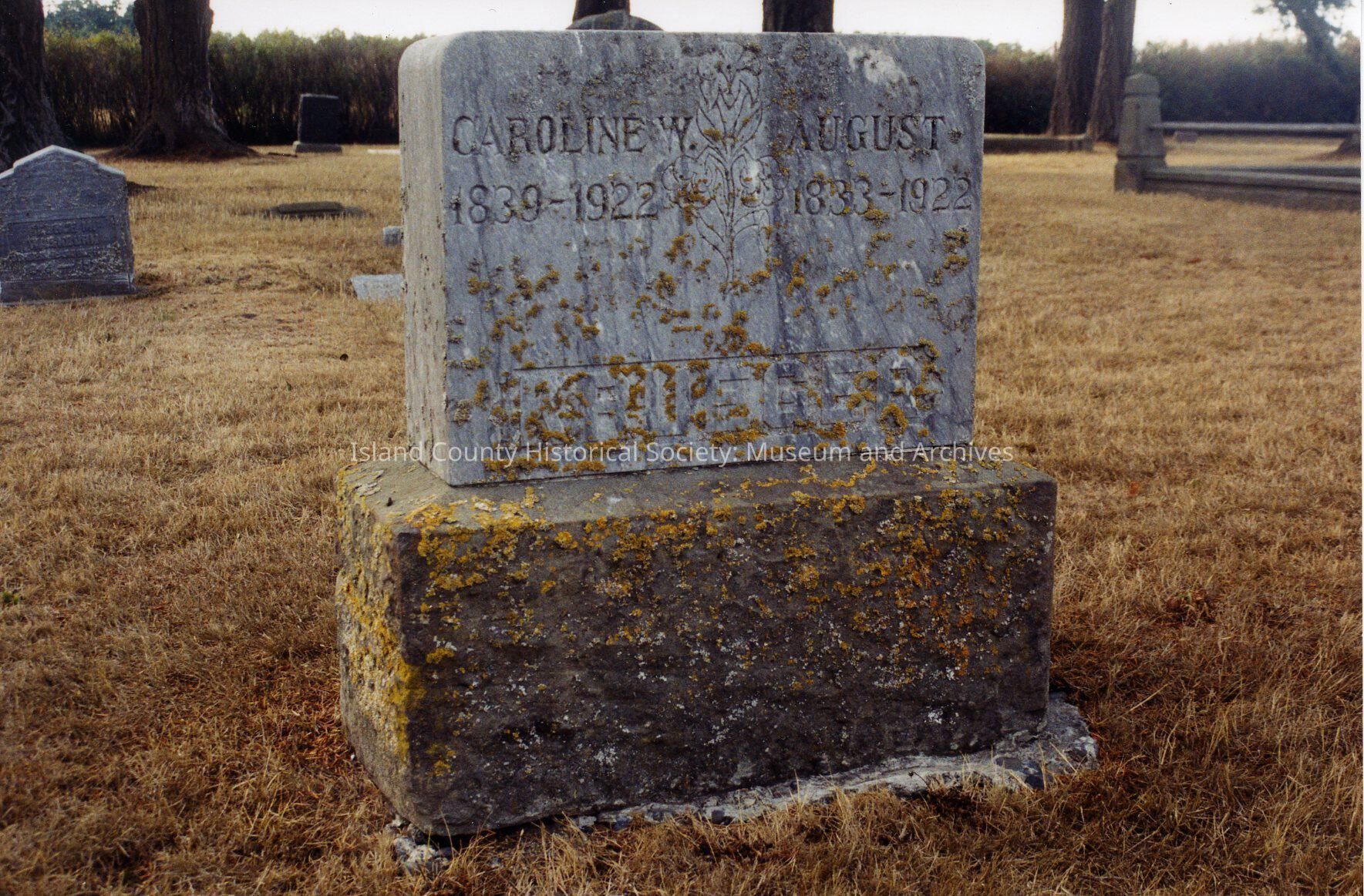 Gravestone in Sunnyside Cemetery. Family name: Krueger. Individual names: Caroline W. 1839-1922. August 1833-1922.