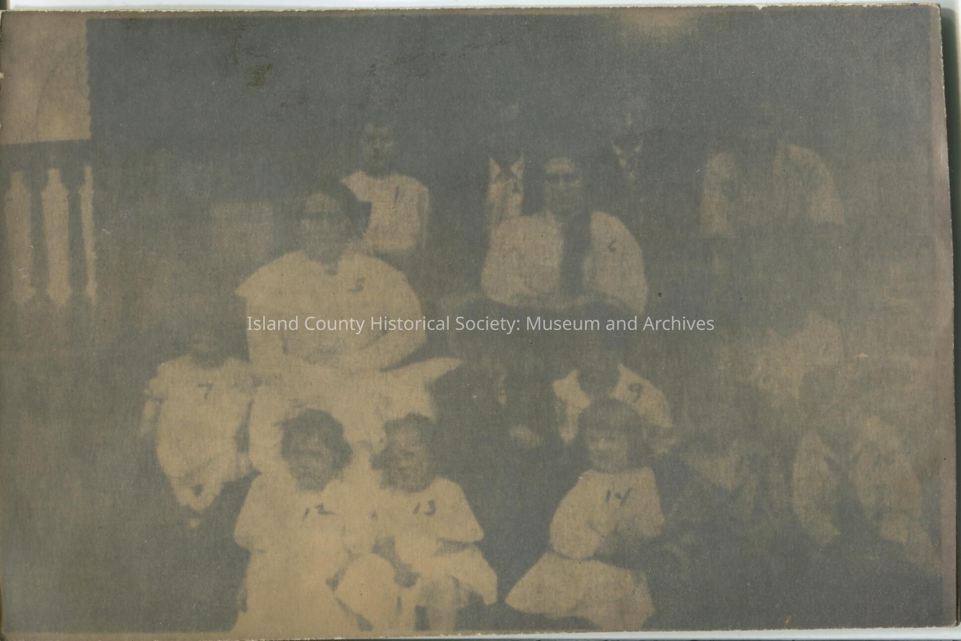 Duplicate photo of 2016.167.049. Black & white photo of a group of children and young people. The photo is mounted on cardboard.