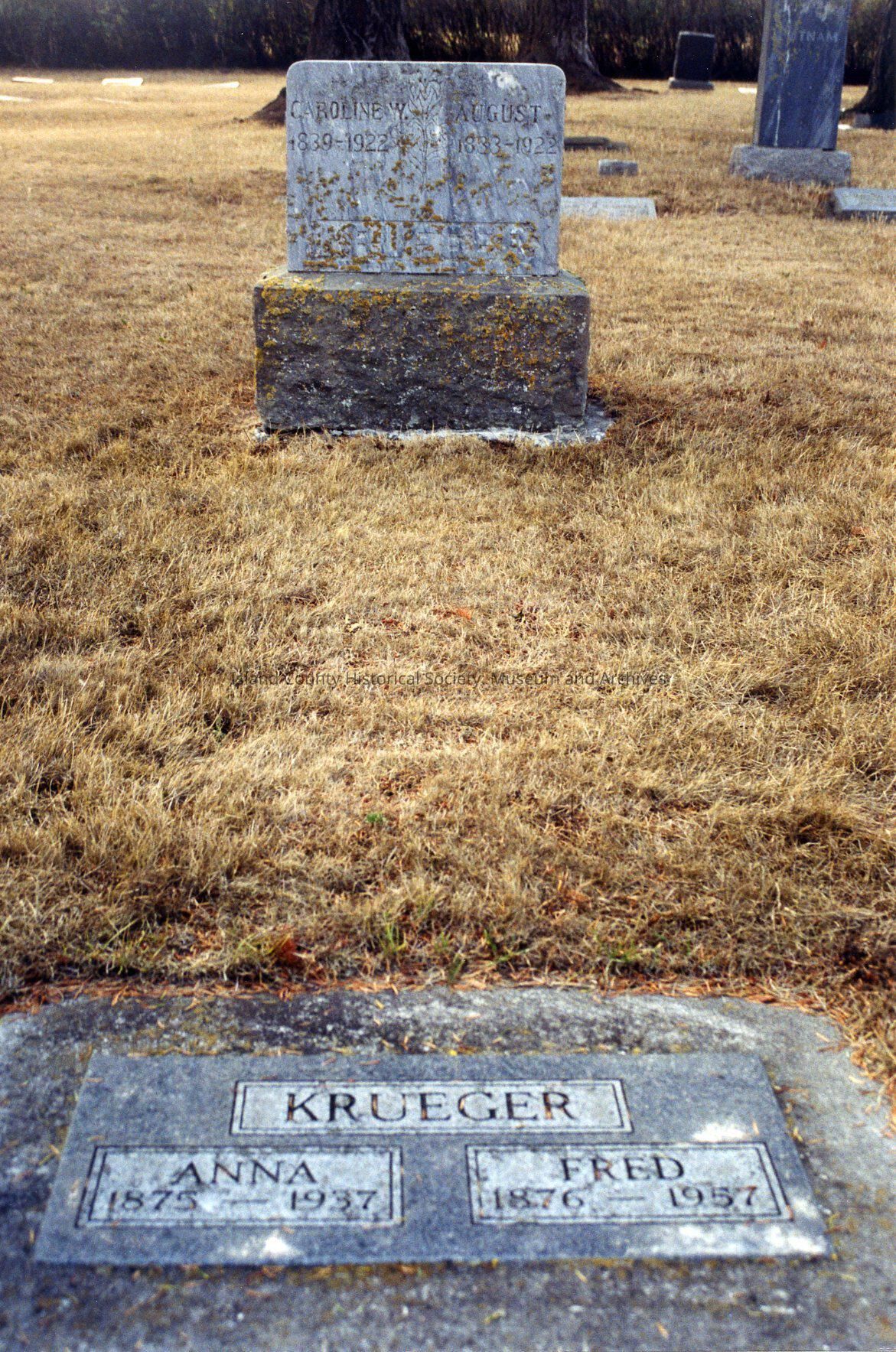 Gravestone in Sunnyside Cemetery. Family name: Krueger. Individual names: Anna 1875-1937. Fred 1876-1957. In background is marker of Caroline and August.