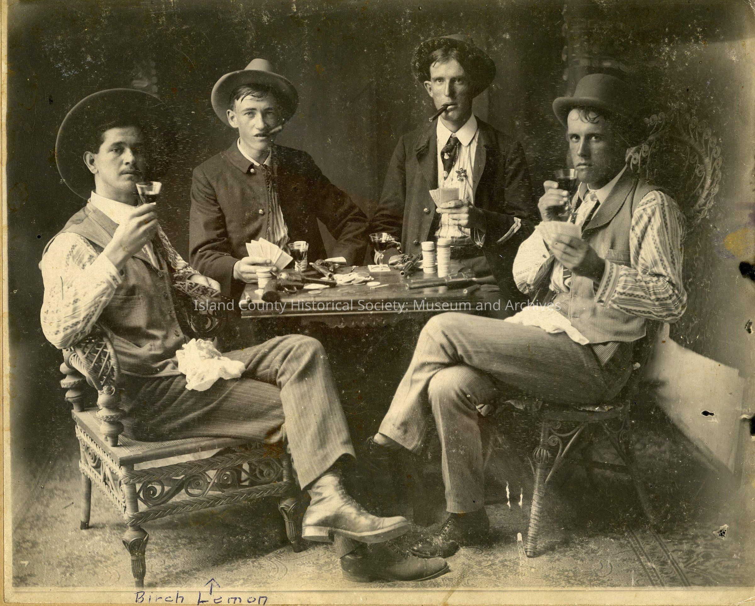 Four young men pose as card-playing gunslingers. Two have cigars and two have drinks. Front left is identified as Oliver Berch Lemon (1877-1954), who served at Ft. Casey. (Birch Lemon). On the back: A. L. Alexander and Bismark, Coupeville, Wn, 1881.