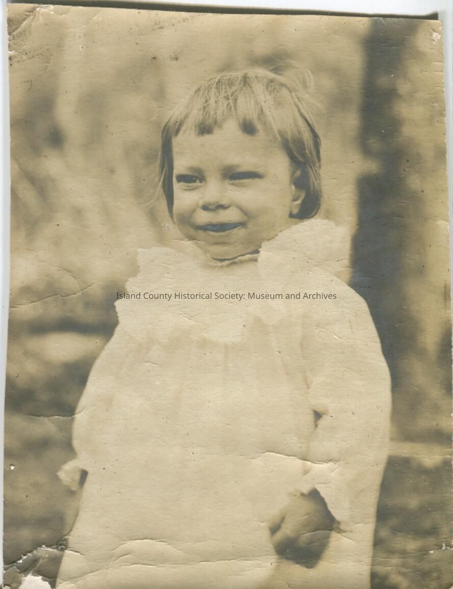 Black & white photo of baby boy in a long sleeve dress with flouncy collar. Written on the back, "Duncan Dickey 3 years".