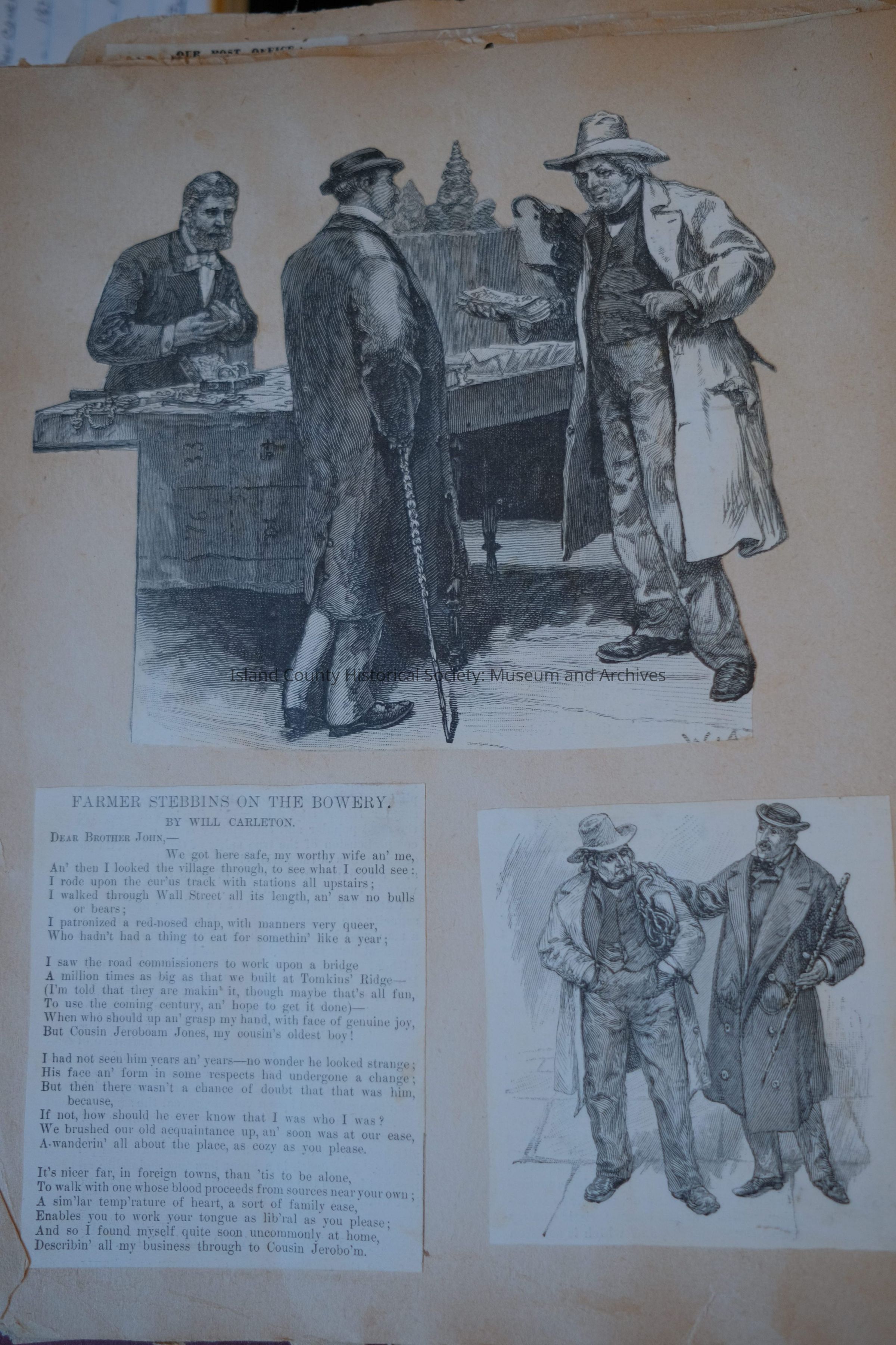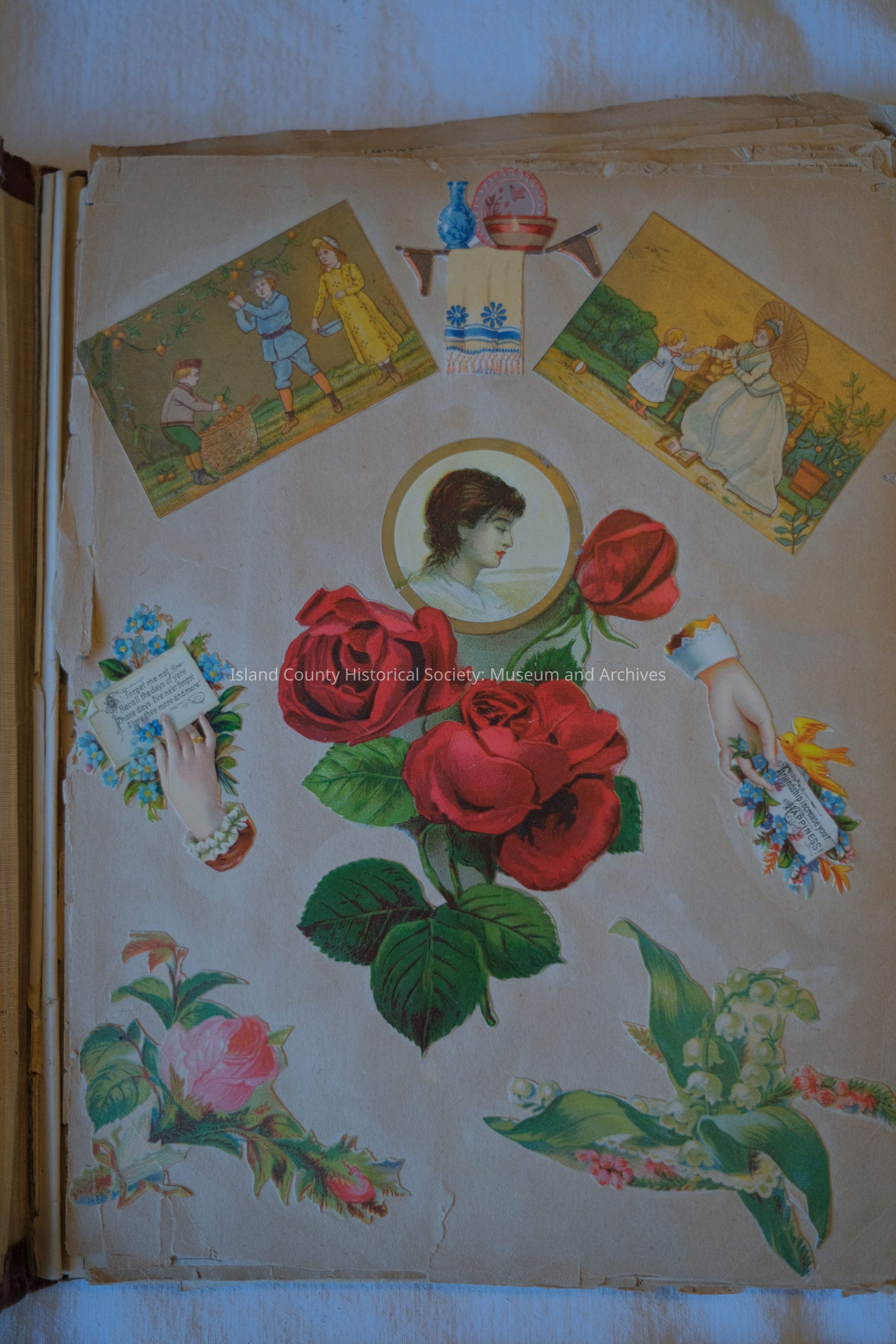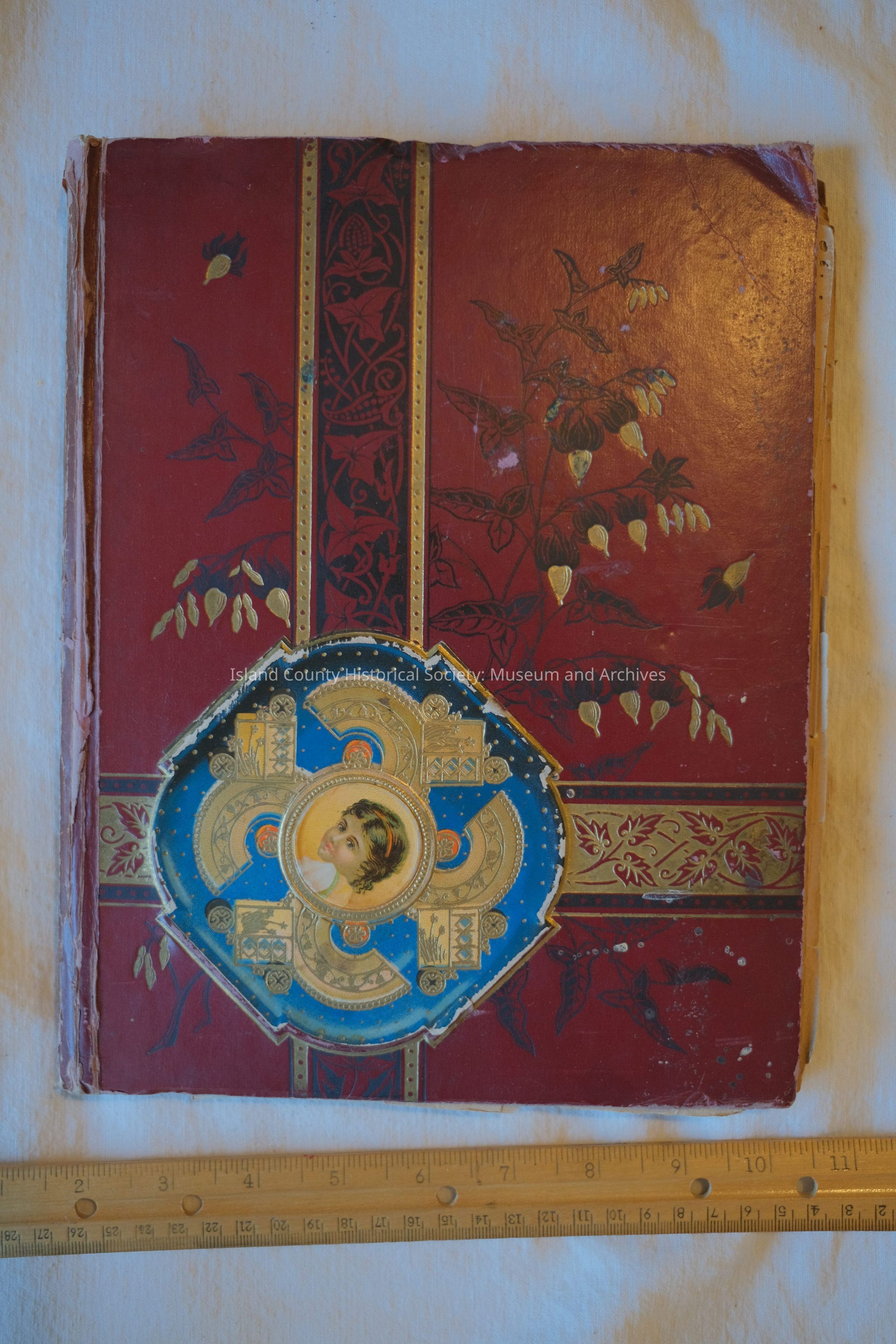 maroon scrapbook w/ image of young child on cover - filled with news clippings/poems, postcards, pictures