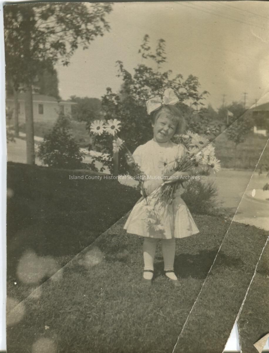 Black & white photo of little girl in a dress with a large bow in her hair. She is standing on a lawn and is holding armfuls of daisies. Written on the back, "Priscilla Perr...? (sp.) 1910".