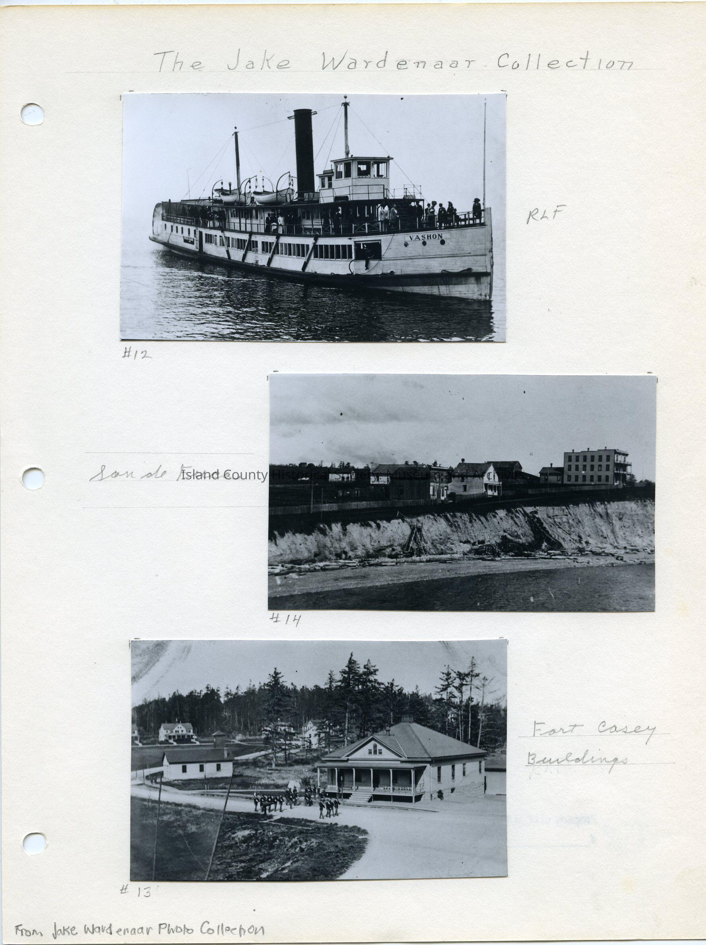 A page with three photos under the heading The Jake Wardenaar Collection. On the top: #12, RLF, the Vashon ferry. Center: Sand de Fuca, #14, A photo of San de Fuca from the water looking along the shoreline and the buildings. Bottom: #13 Fort Casey buildings, with troops marching in formation.