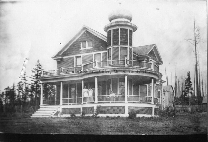 There are several people standing on the lower porch, identified from right to left as Ben Loers, his wife Alice Loers, Aletta Loers, Winnie Loers