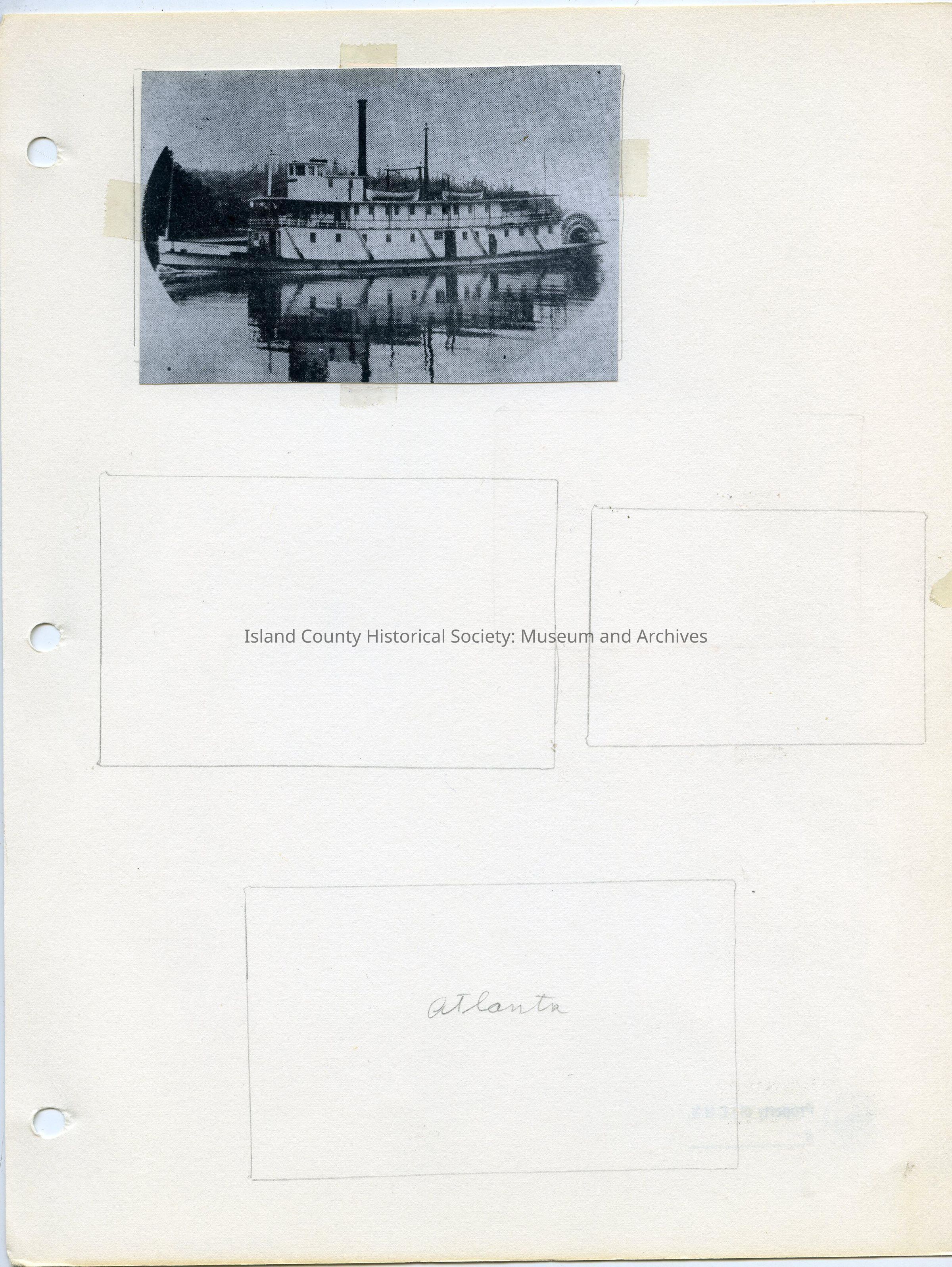 A page with one photo with penciled spaces for other photos. On the top: a ferry with paddle wheel at the stern. Bottom is a space for a photo labeled Atlanta. From the Jake Wardenaar Collection photos folder.