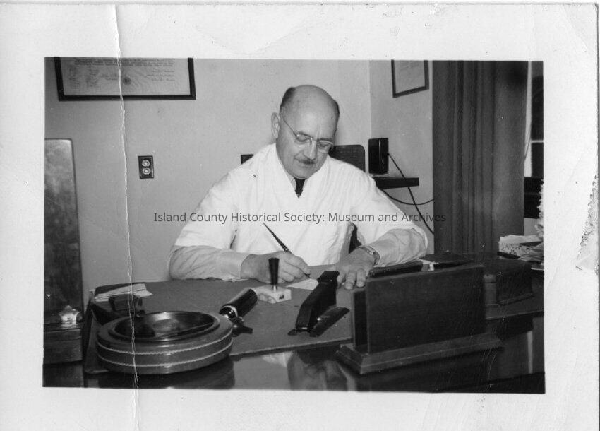 DR Carskadden sitting at his desk wearing a lab coat while writing. Stamp on back - silver glaze finish; Jan 25 1950
