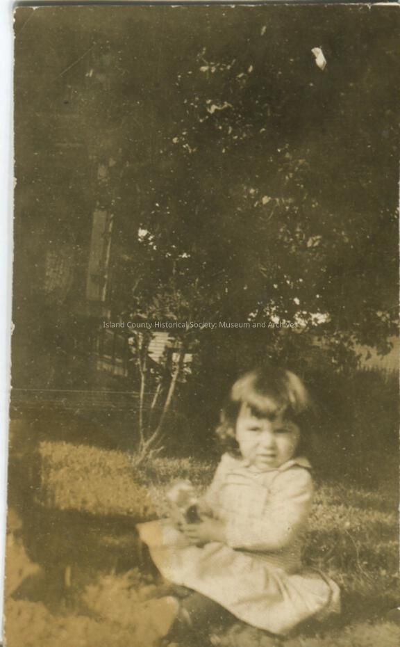 Black & white photo of a small girl with short brown hair sitting on a lawn. No description or date.