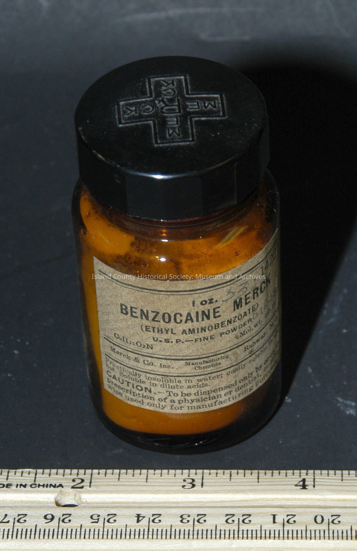 Brown bottle 3 1/4" with cap. Merck - Benzocaine Powder - full.