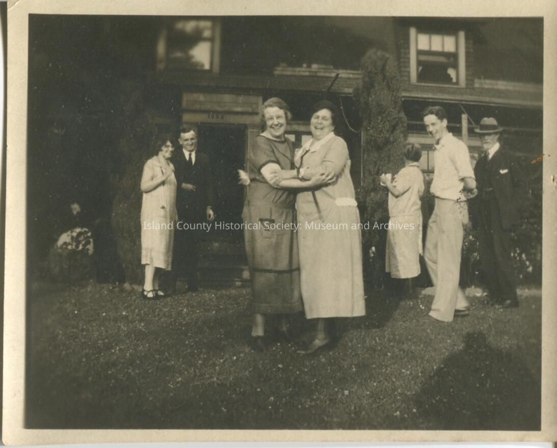 Black & white photo of seven women and men on a lawn in front of a house. The two middle aged women embracing each other in the center are in mid-calf dresses. There is a couple in the left background. Also, there is a woman in a light dress in the right background as well as a older man and a young man.