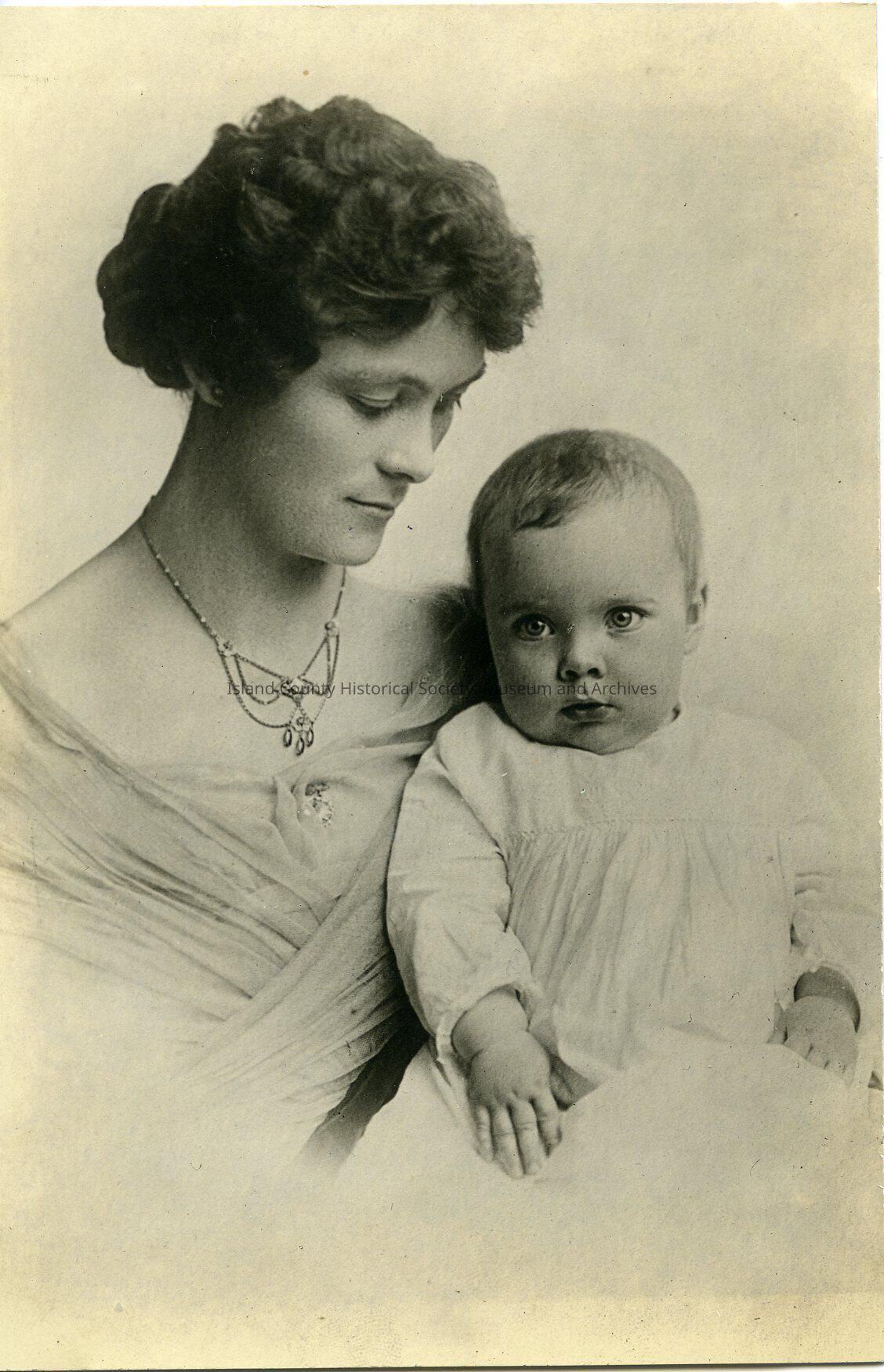 Black & white portrait photo of Effie Taylor Gillespie as a young woman holding Mary Carlene Gillespie as a baby. Effie is on the left. She has wavy, light brown hair pinned behind her head. She's wearing a gauze dress with a scooped neck and a necklace. Effie is looking down at Mary Carlene who is sitting on her lap. Mary is wearing a light colored smock. No date.