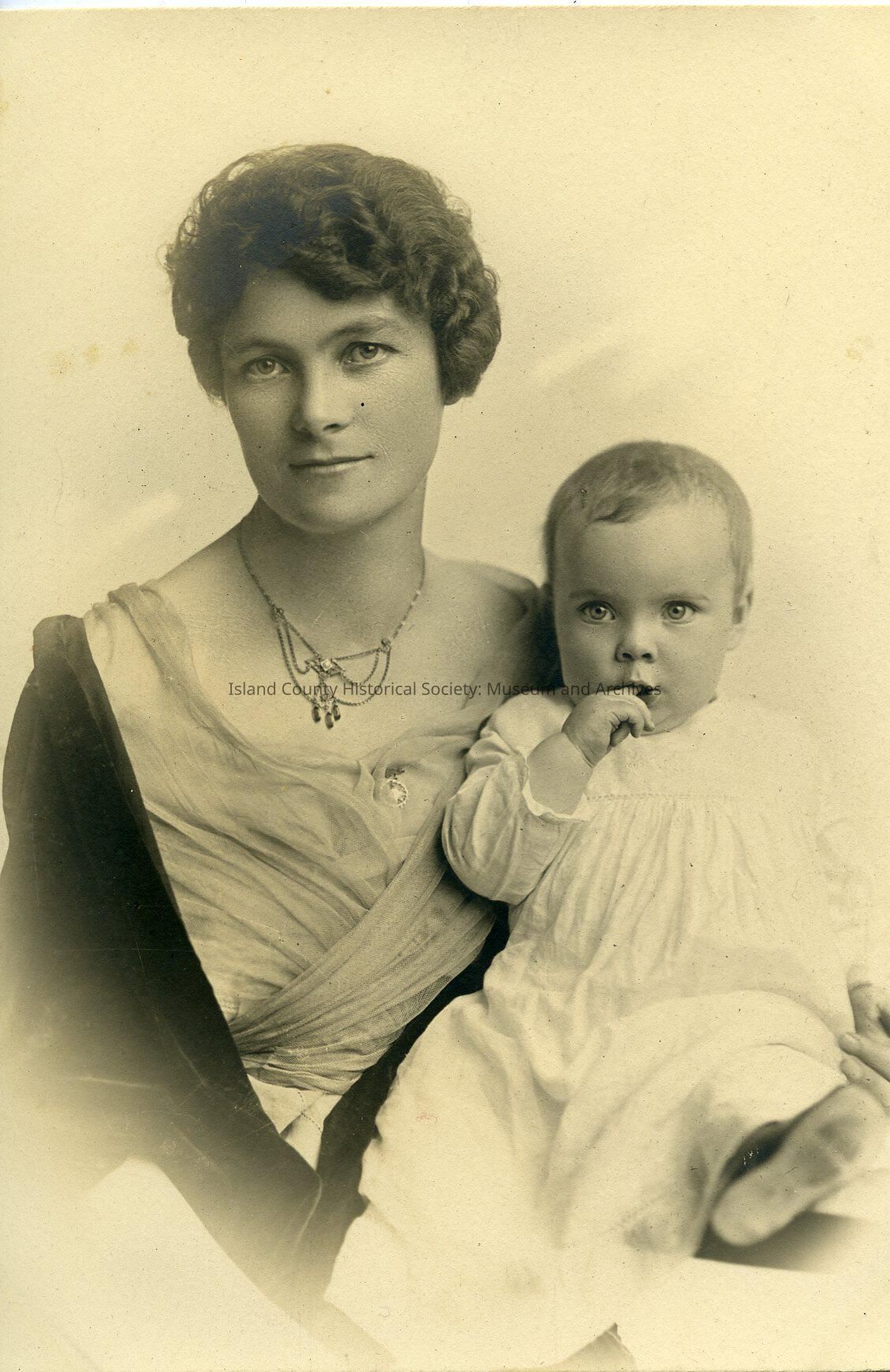 Black & white portrait photo of Effie Taylor Gillespie as a young woman holding Mary Carlene Gillespie as a baby. Effie is on the left. She has wavy, light brown hair pinned behind her head. She's wearing a gauze dress with a scooped neck and a necklace. She also has a dark colored wrap around her shoulders. Effie is looking forward at the camera. Mary Carlene is sitting on her lap with her right index finger in her mouth. Mary is wearing a light colored smock. The bottom of one shoe is showing. No date.