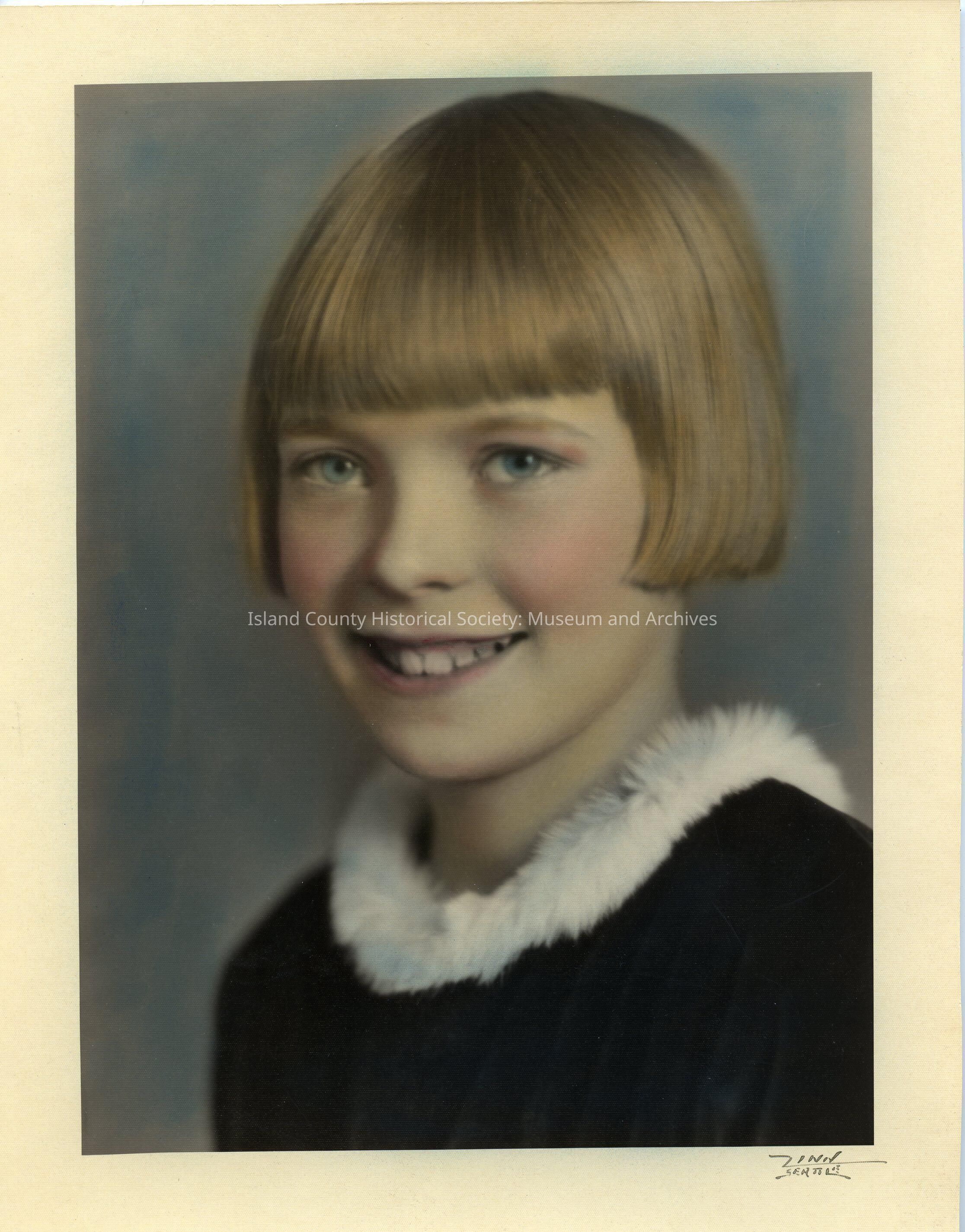 Colorized portrait photo of (Mary) Carlene Gillespie as a young girl. She has blue eyes, blonde hair in a page-boy style with bangs. She is wearing a black dress with a white, fur trimmed neckline. No date.