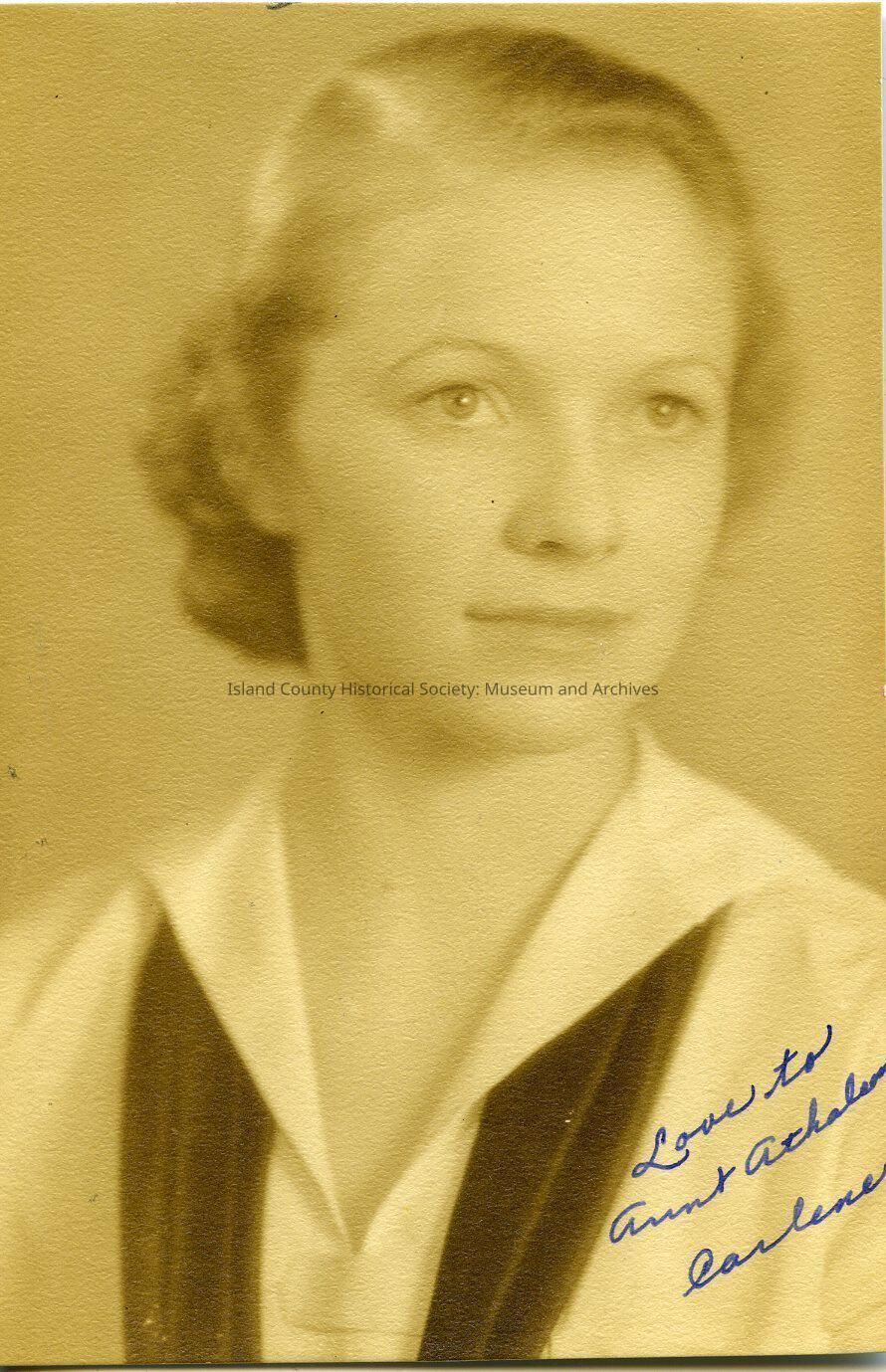 Black & white portrait photo of (Mary) Carlene Gillespie as a young woman. She has light hair parted on the side & pulled back. She is wearing a white v-neck blouse with a dark scarf under the collar. No date.