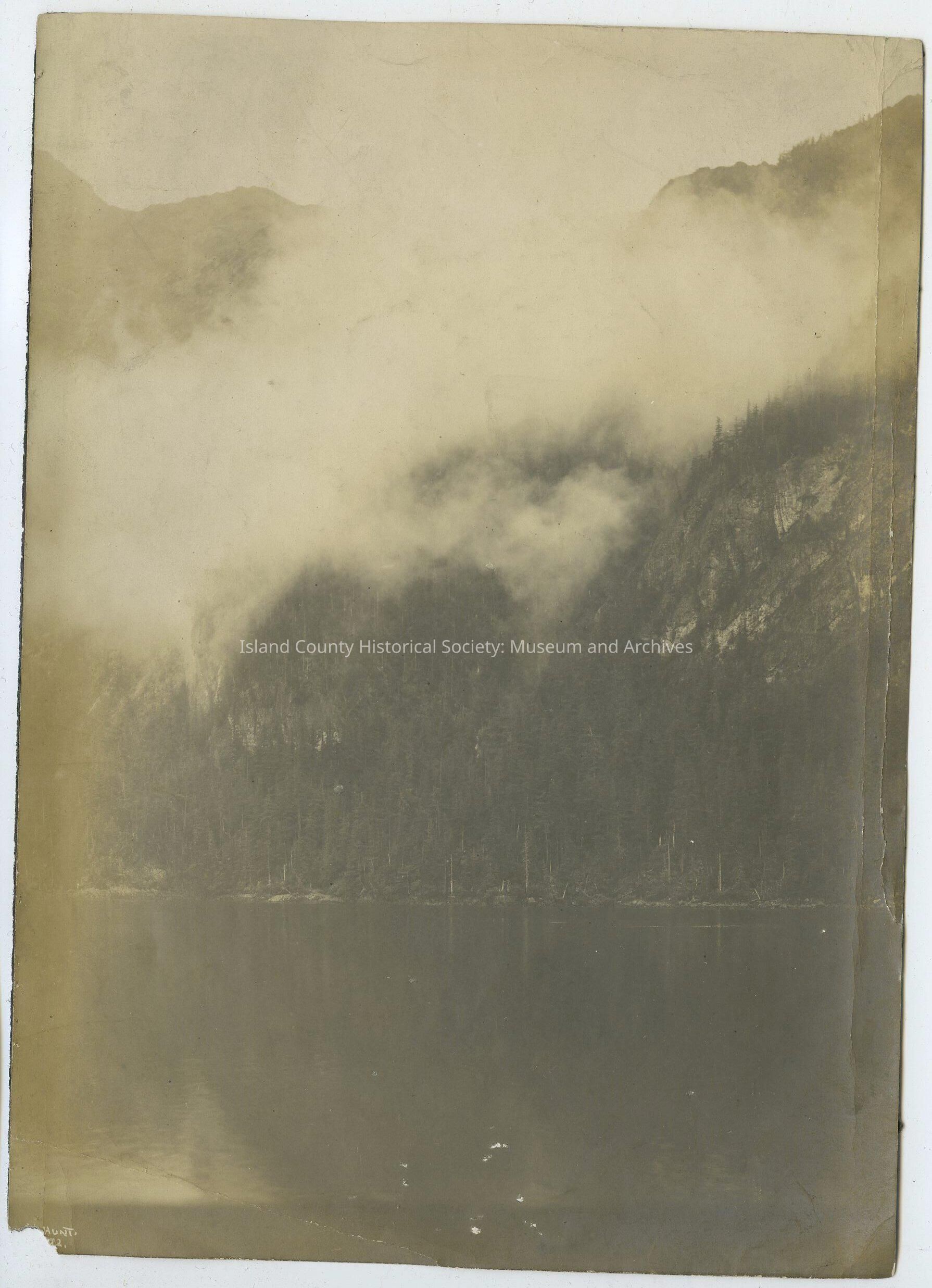 Black and white photo of a lake with a high mountain behind it. In the lower left corner of the photo is printed Hunt. Rest of corner is torn off. No description or date.