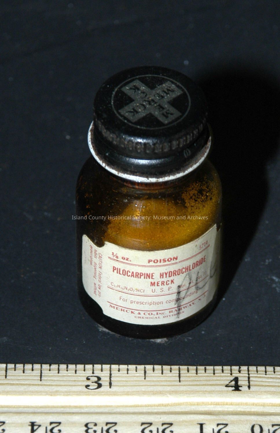 Brown bottle 1 3/4" with cap. Merck. Pilocarpine Hydrochloride. powder - 1/2 full