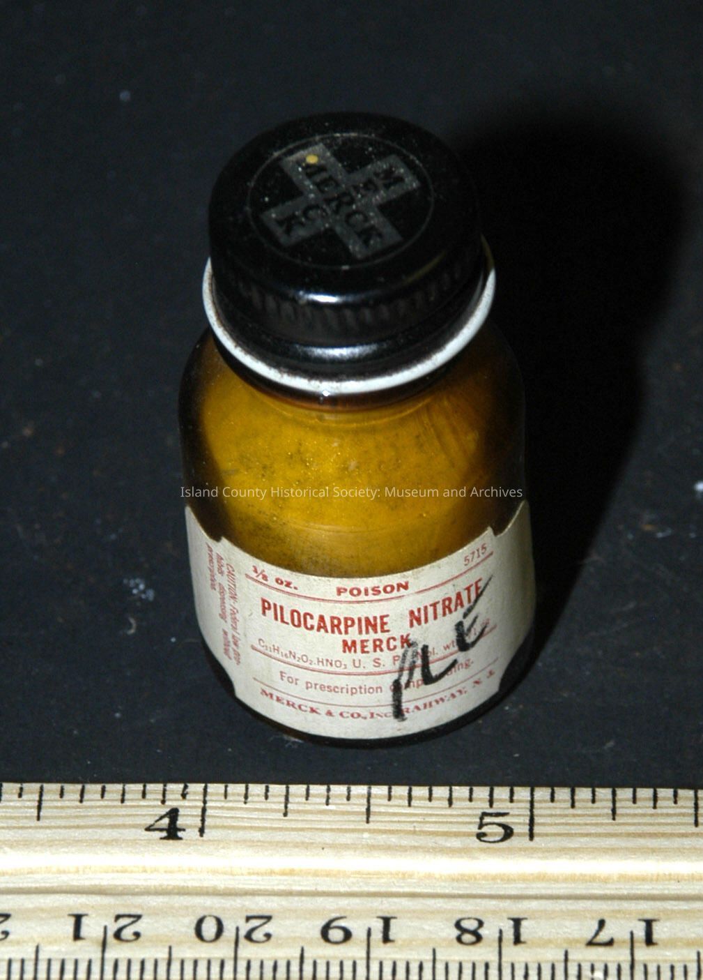 Brown bottle 1 3/4" with cap. Merck. Pilocarpine Nitrate powder - trace