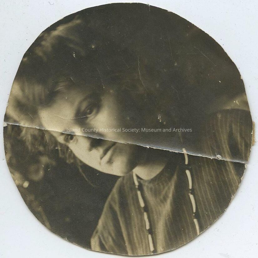 Black and white photograph of the head and shoulders of a young woman. She is dressed in a sweater with a bead necklace. Description on the back says, "Hester Dickey". No date.