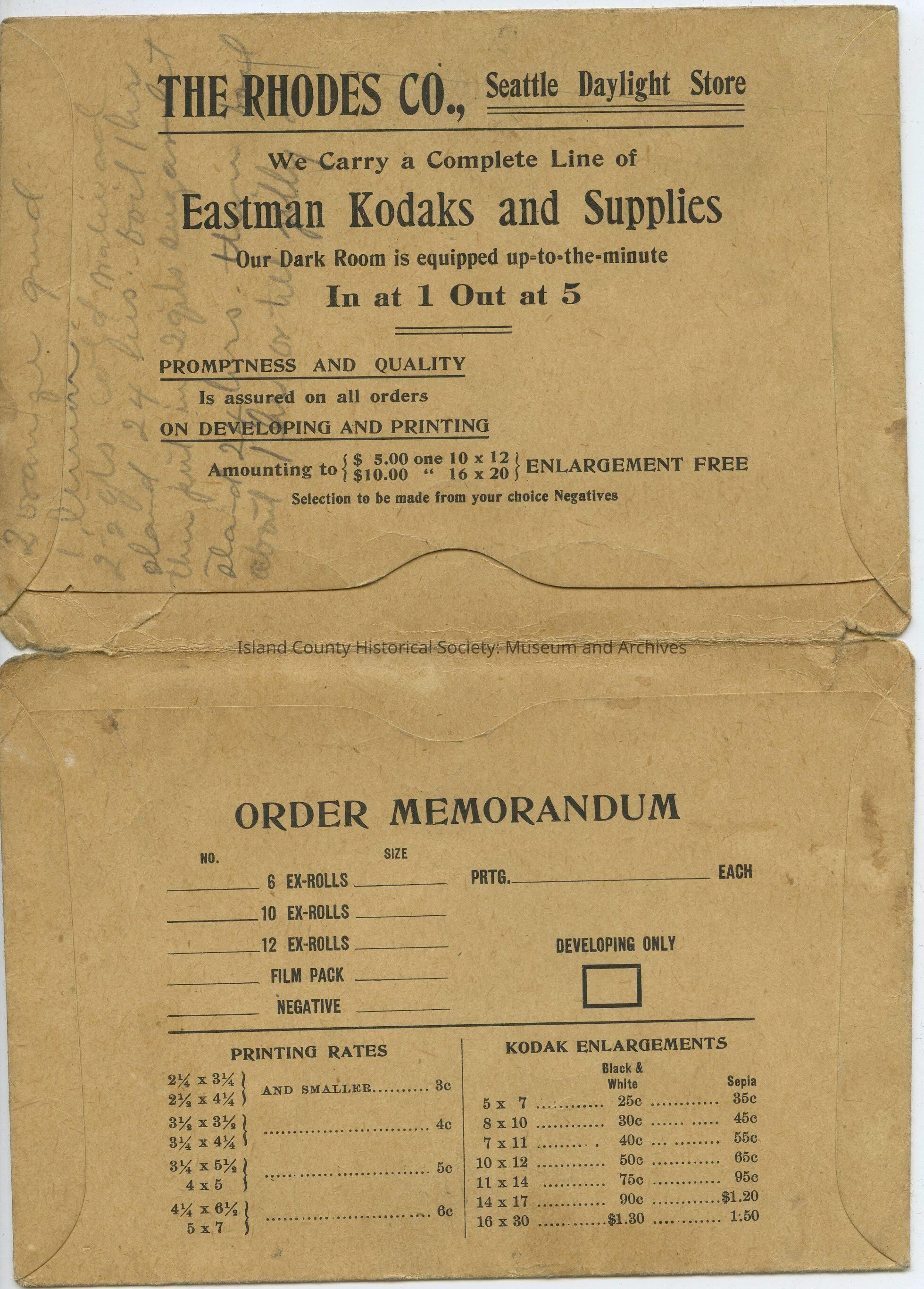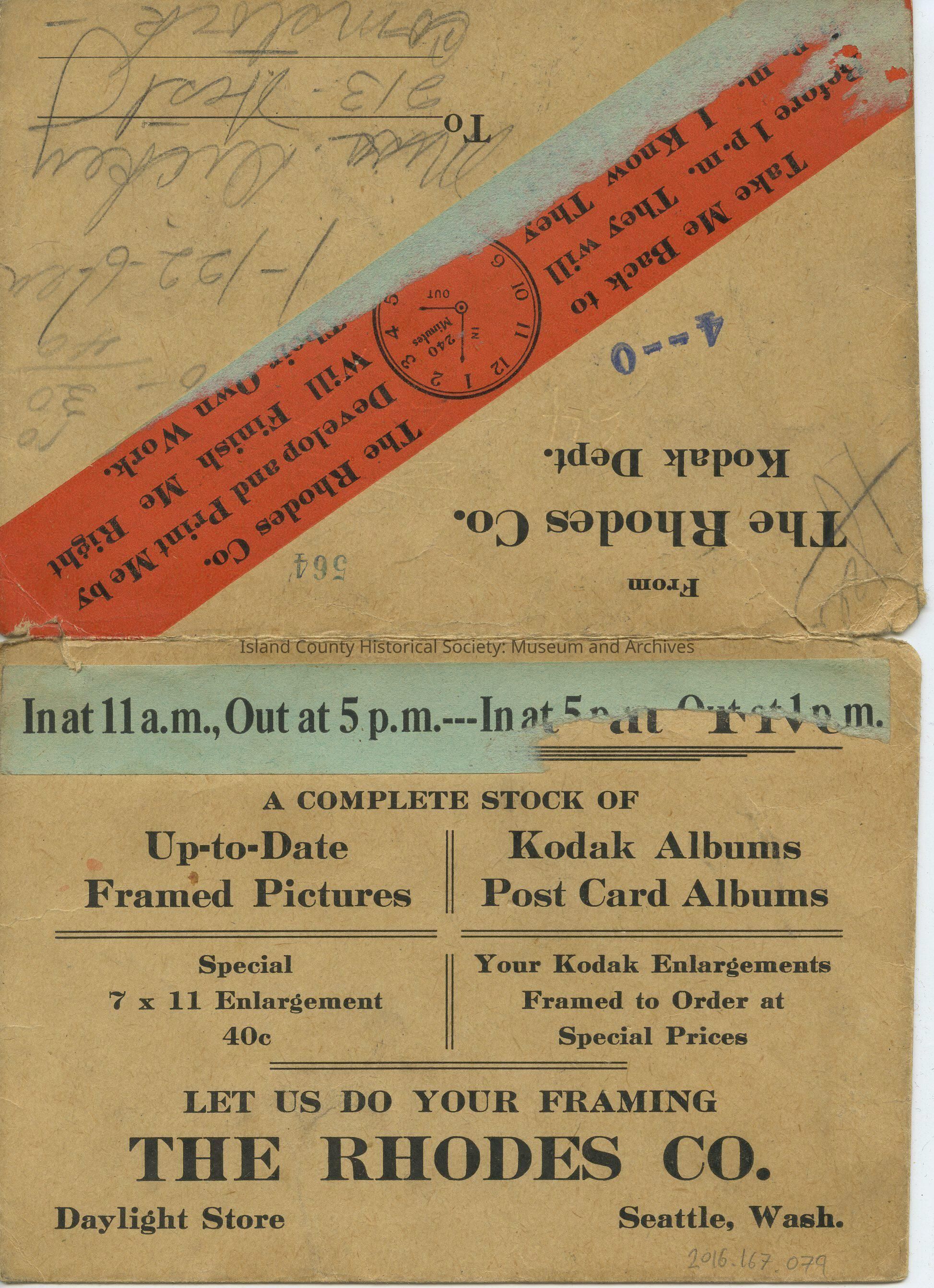 The Rhodes Co. Kodak Dept. paper mailer. Addressed to Miss Dickey, 213 West Comstock. No description or date.