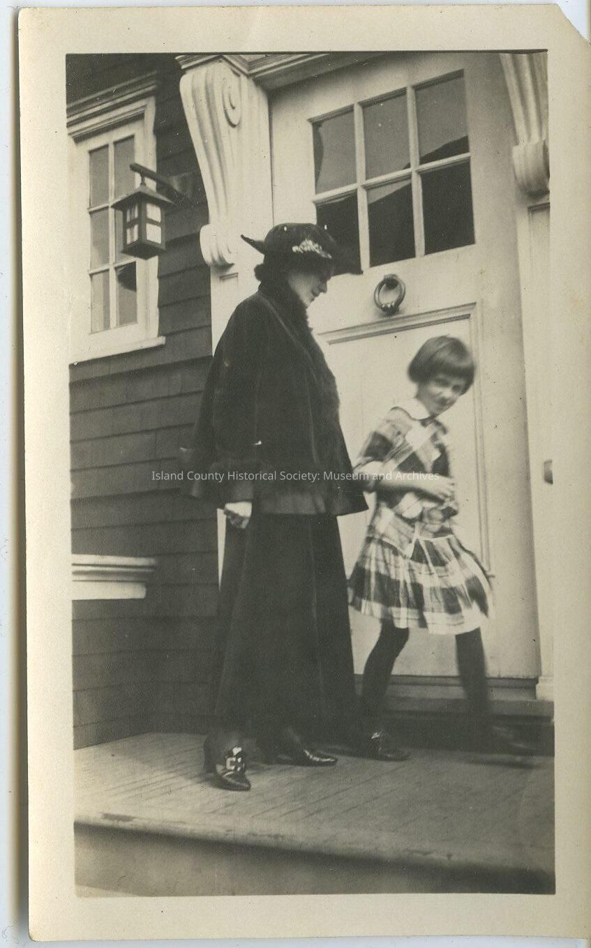 Black & white photo of a woman and young girl standing in front of a door. The woman is wearing a wide brimmed hat, long skirt, and hip length outer jacket. The young girl has a paige-boy haircut and is dressed in a plaid dress. No description or date.
