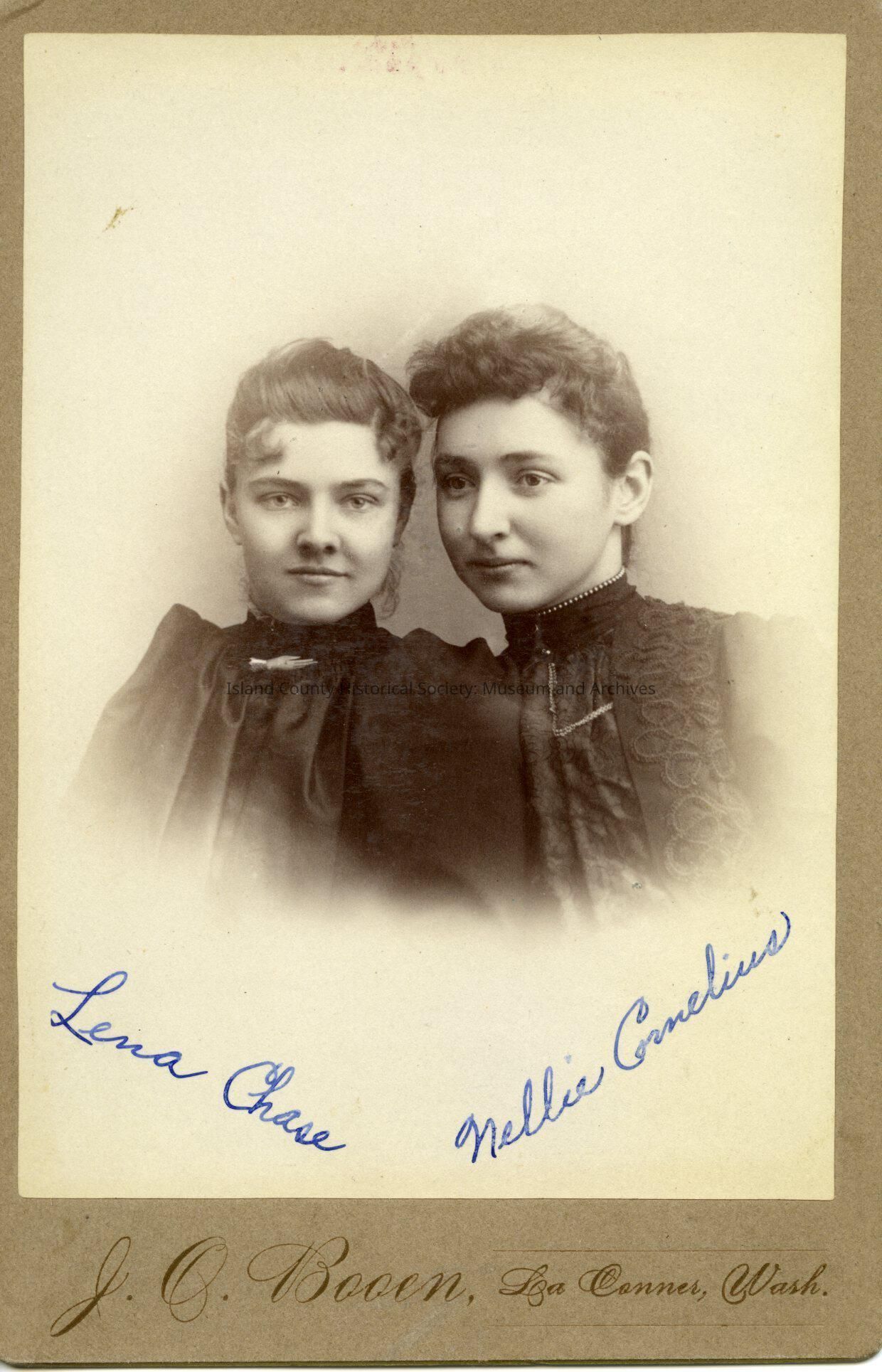 Portrait of Lena Chase and Nellie Cornelius, both wearing dark high neck dresses. On the back: Libbie H.
