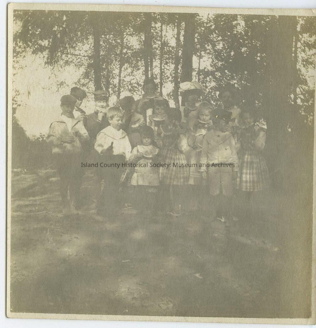 Black & white group photo of 12 young boys and girls with 2 adults. They are standing under a tree eating watermelon. No description or date.