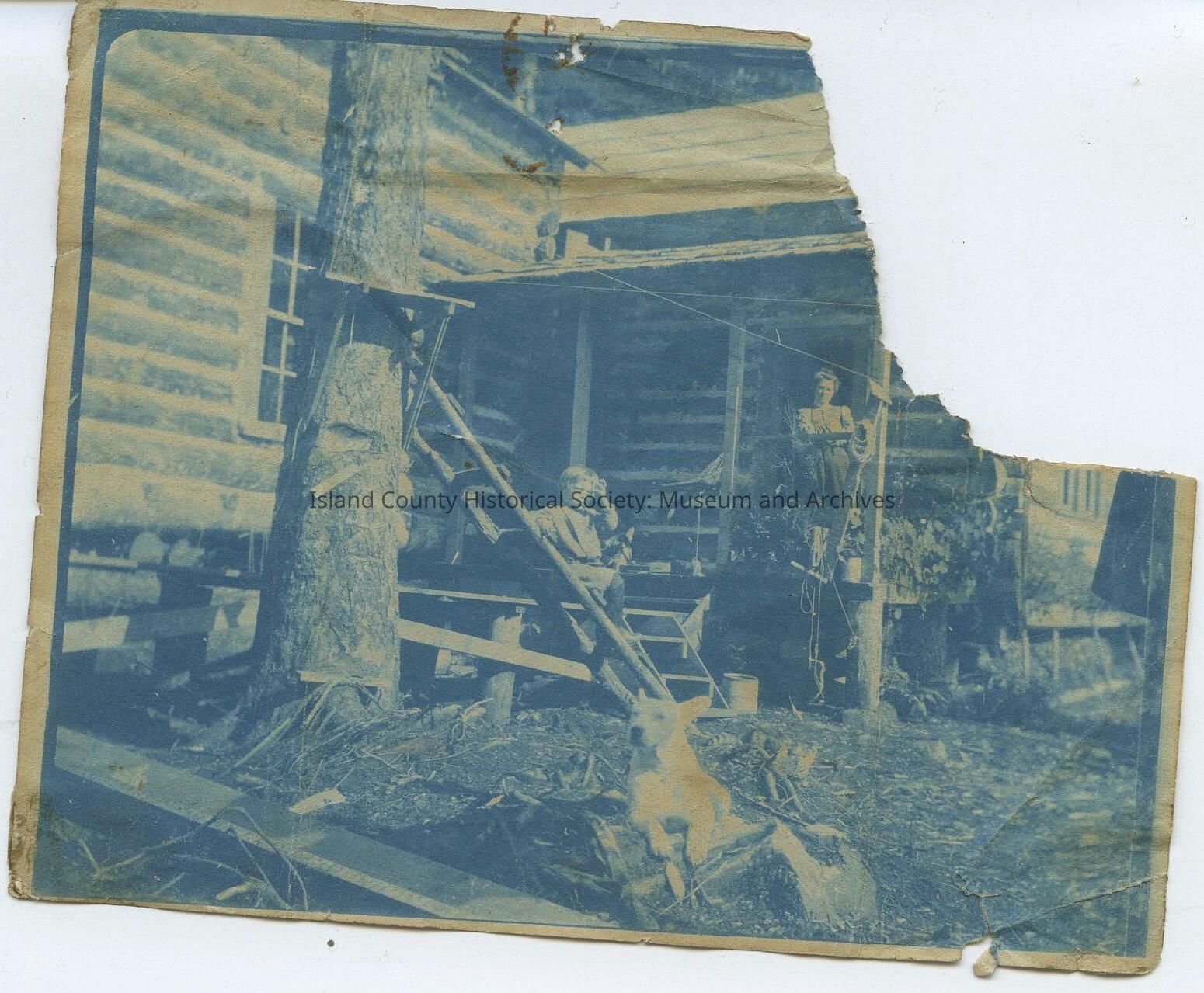 Black & white photo of a log cabin. The photo is printed or copied on paper and has a blue cast. There is a woman on the porch, a young boy on a ladder, and a dog in the foreground.