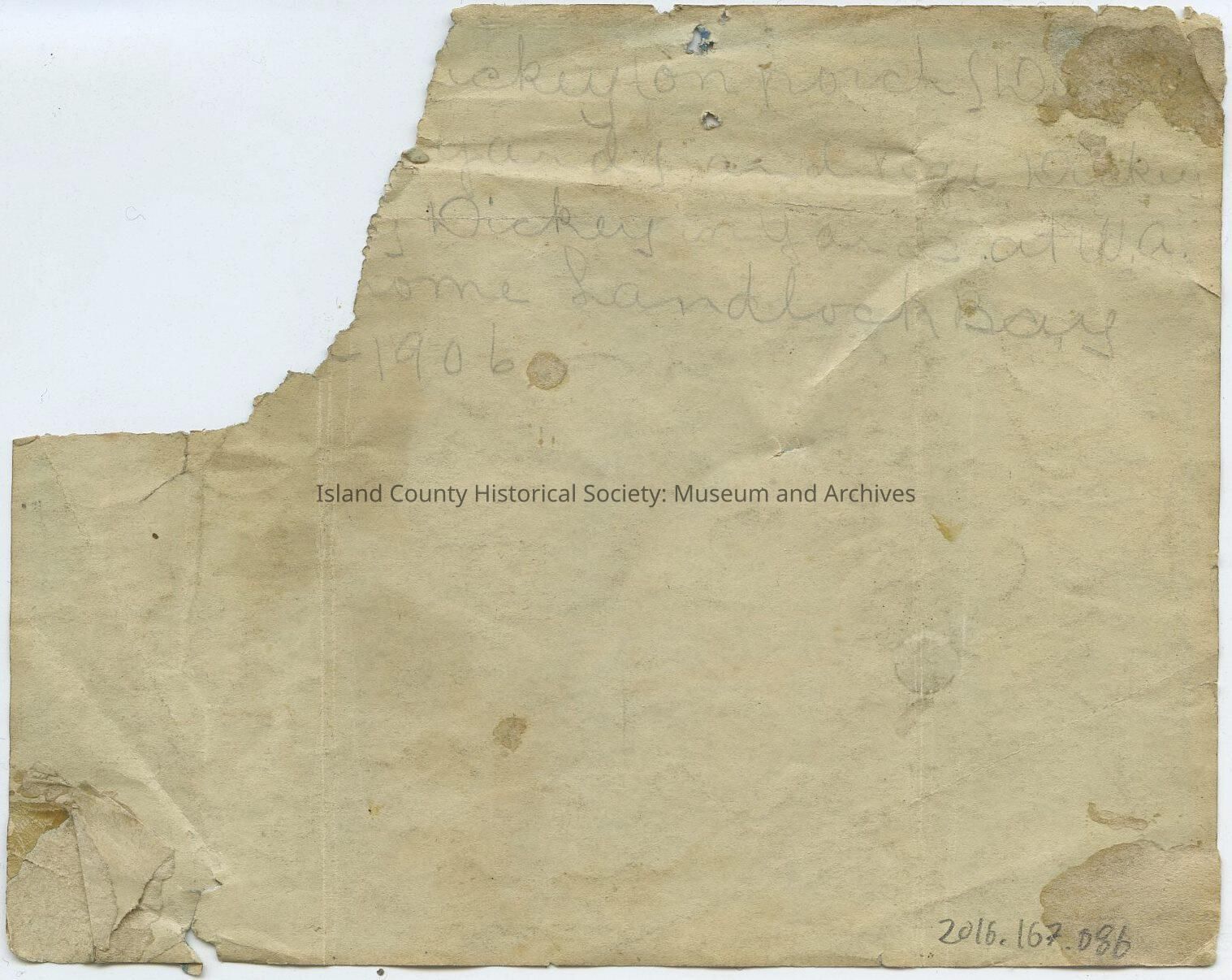 On the back, a portion of the hand written note is missing. The portion remaining is difficult to read - it says the woman on the porch is "... Dickey", and the words Landlock Bay and 1906 are written.
