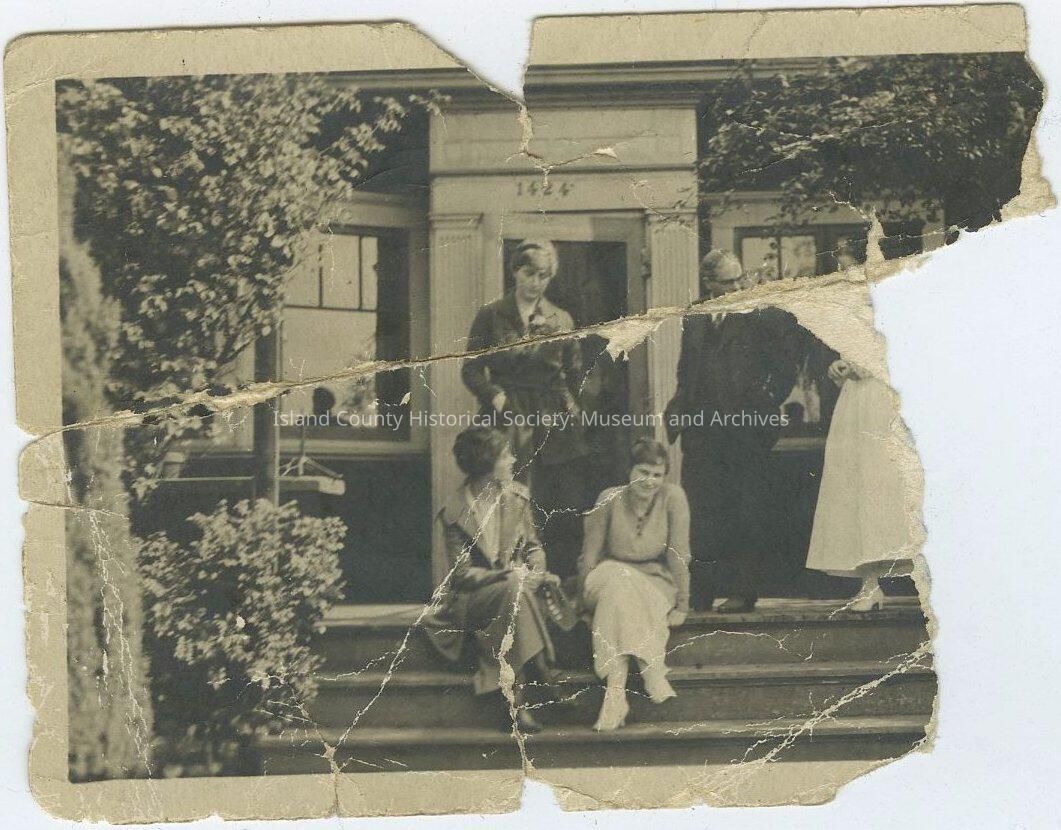 Black & white photo of 4 women and a man standing/sitting on a porch in front of a building with the number 1424. The women are in long dresses and the man is wearing a 3 piece suit. There were names written on the back but the front portion is missing. The names Brown and Dickey are visible and the year 1906.