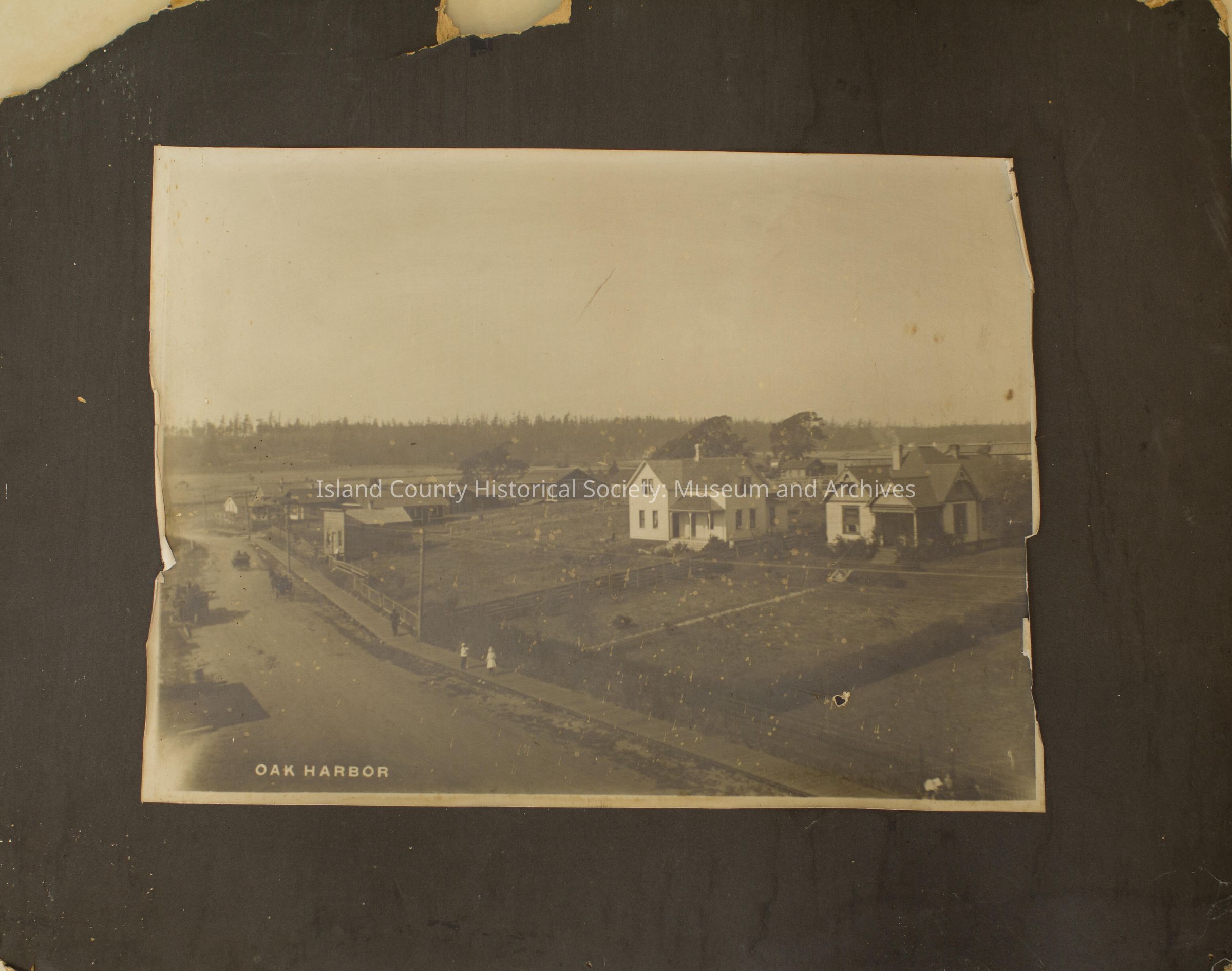 Black and white photo of early Oak Harbor. Image appears to be of pioneer way and dock street. One of the Maylor homes can be seen in the center of the photo. There also appears to be two children walking on the wood sidewalk and an adult dressed in black further up the road in front of them. The image was found in a house in Oak Harbor and donated by Matt Iverson. No other history is known about the image.